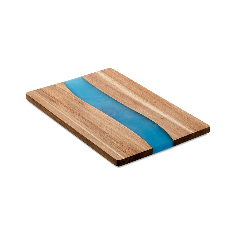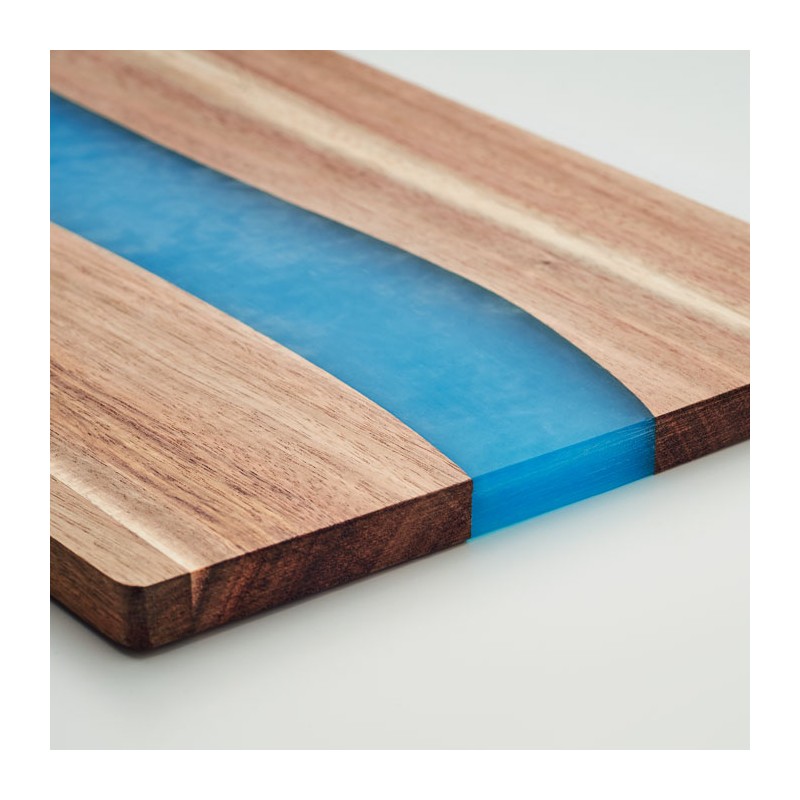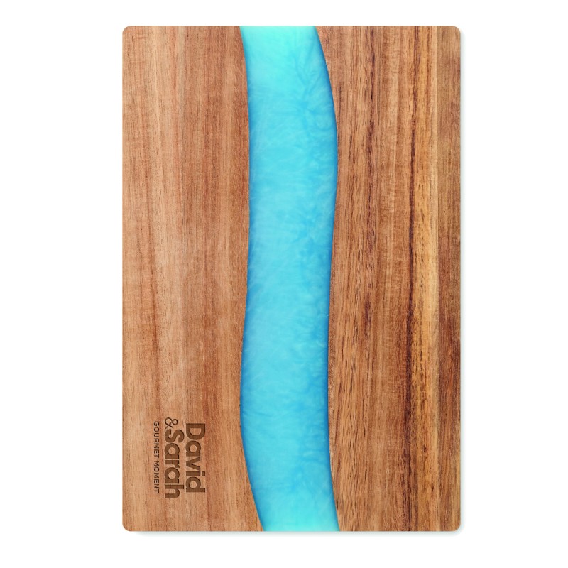 Planche à découper en bois d'acacia avec détails incrustés en résine époxy. Le bois est un produit naturel, et présente de légères variations de couleur, de décoration et de tailles.