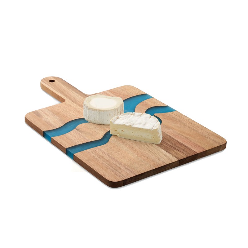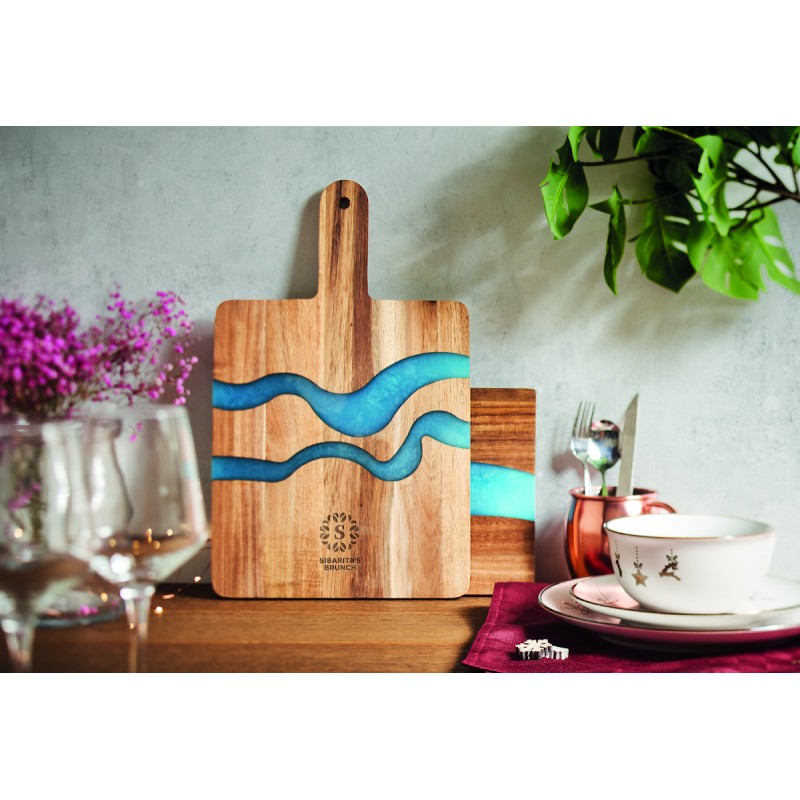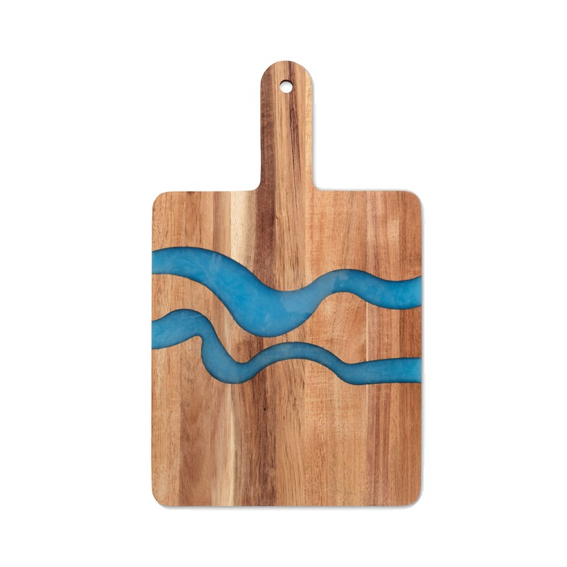 Planche de service en bois d'acacia avec détails incrustés en résine époxy et poignée. Le bois est un produit naturel, et présente de légères variations de couleur, de décoration et de tailles.