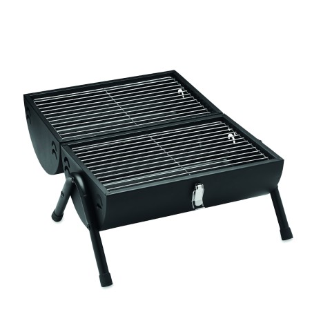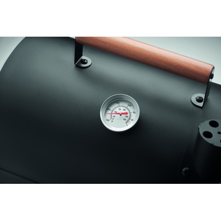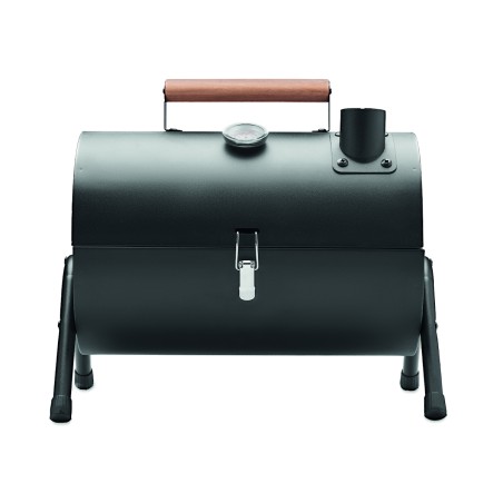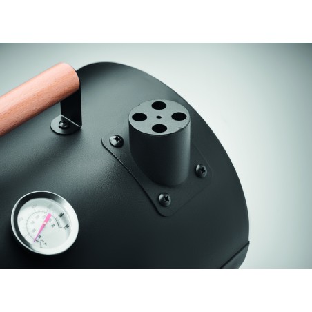 Barbecue portable en fer avec cheminée et indicateur de température. Verrouillage et poignée de transport en bois.