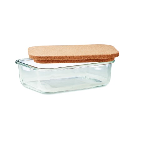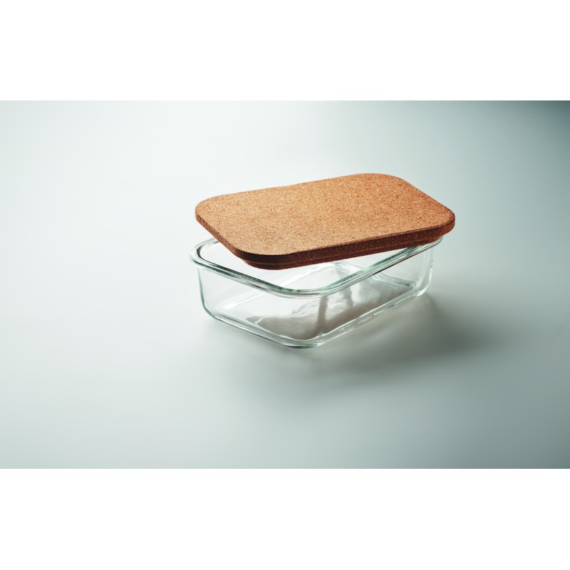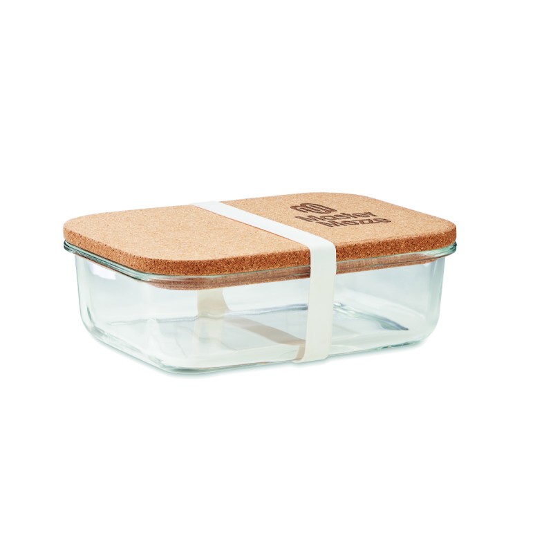 Boîte à lunch en verre borosilicaté de haute qualité avec couvercle en liège et bande en silicone. Capacité : 830 ml.