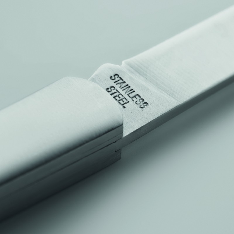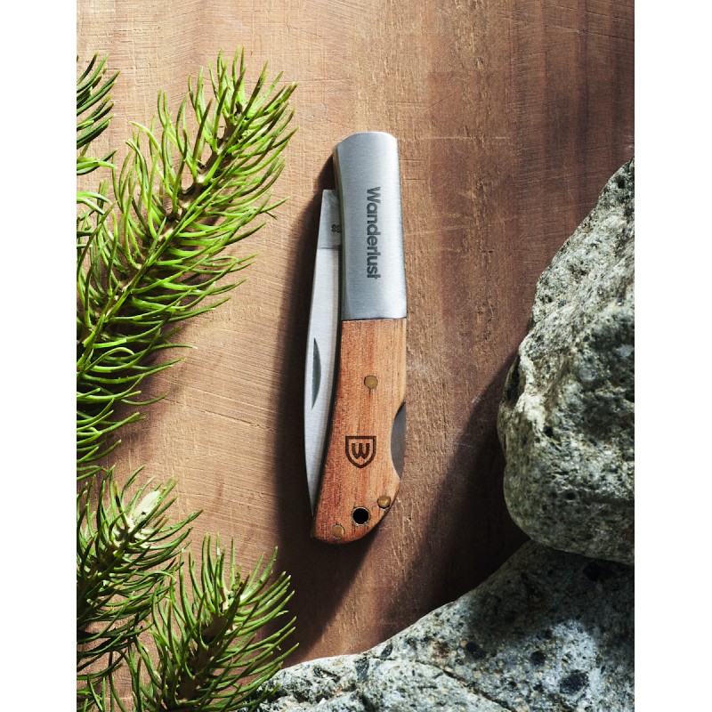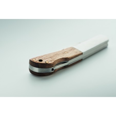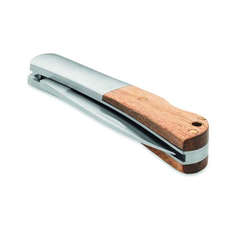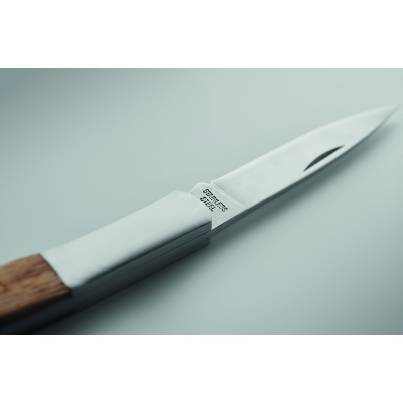 Couteau pliable en acier inoxydable avec manche en bois d'acacia. Longueur de la lame : 6 cm.