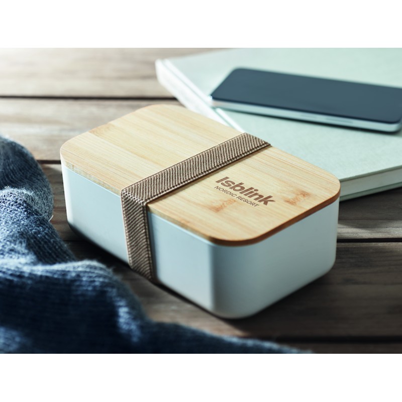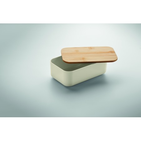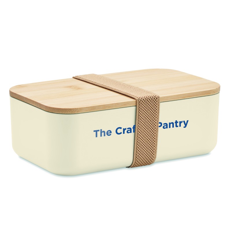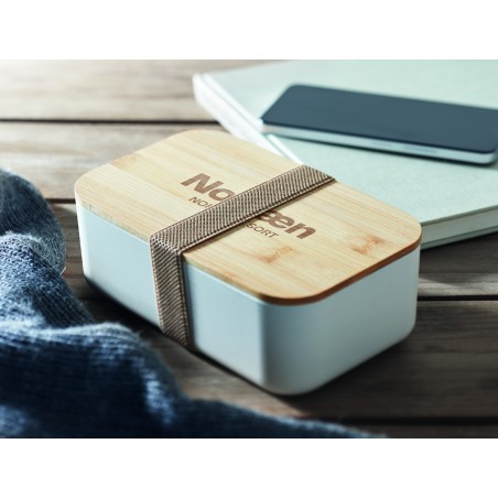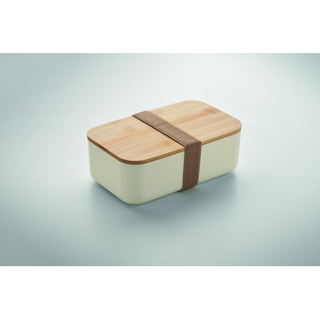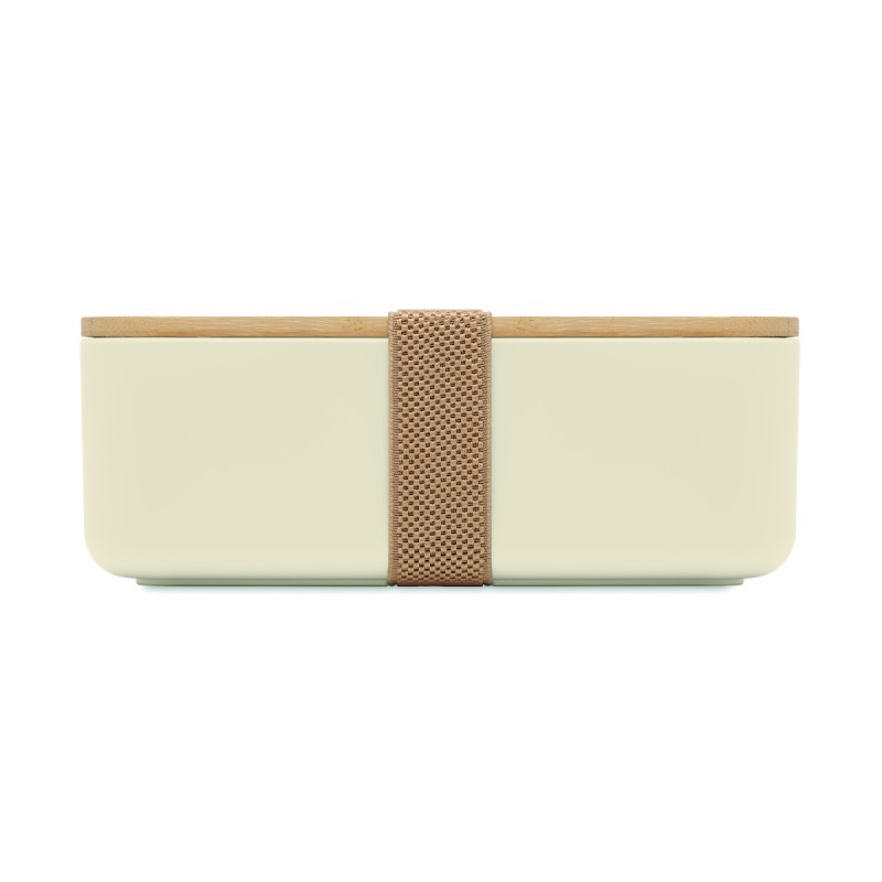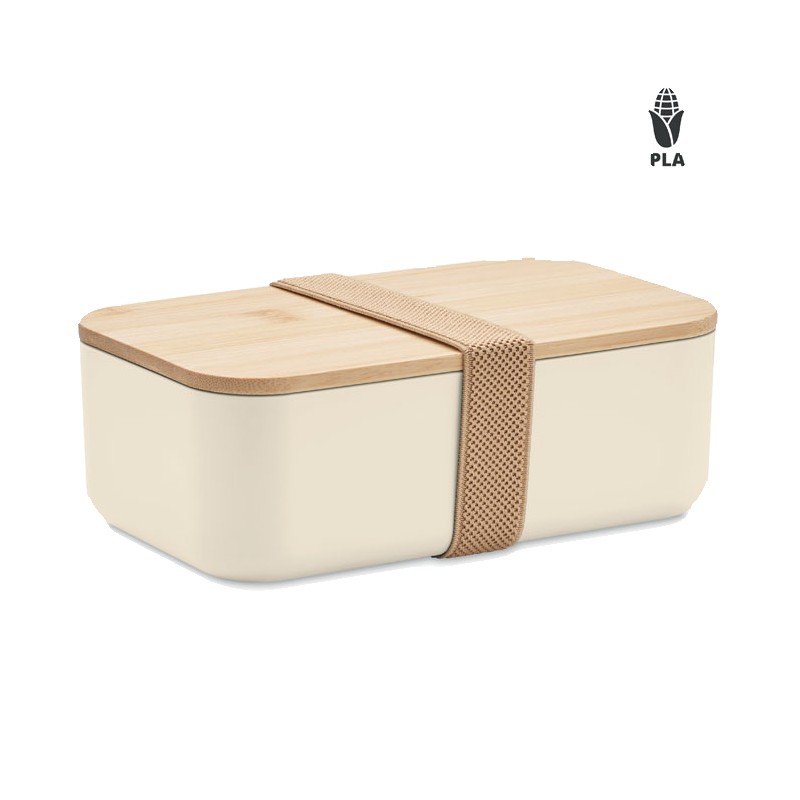 Boîte à lunch en maïs 100% PLA avec couvercle en bambou et fermeture élastique en RPET. Capacité : 1000 ml.