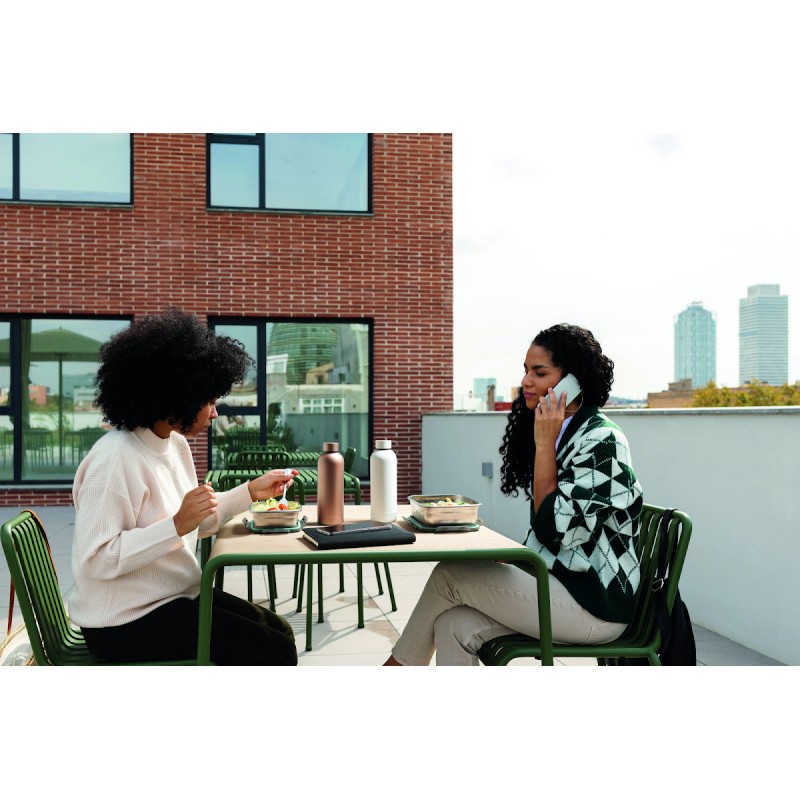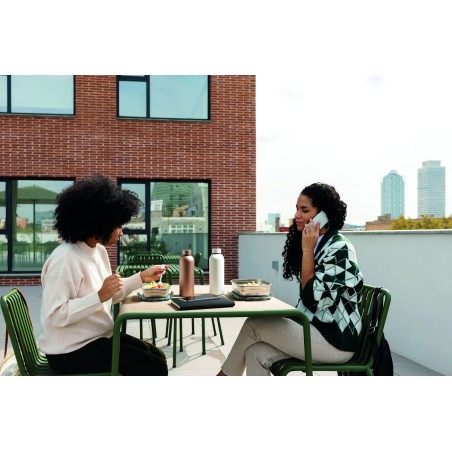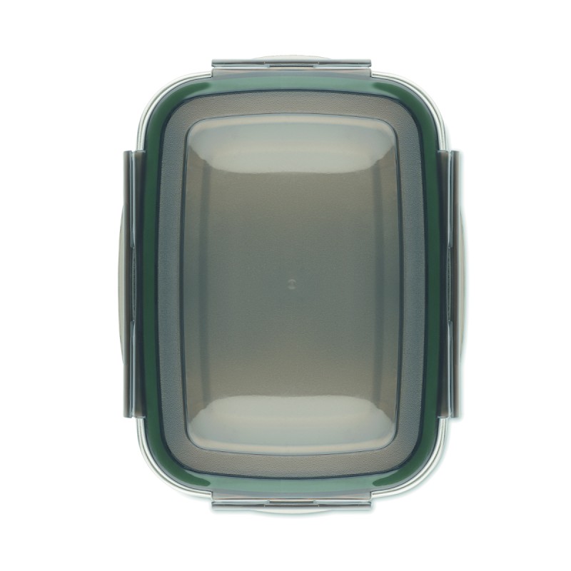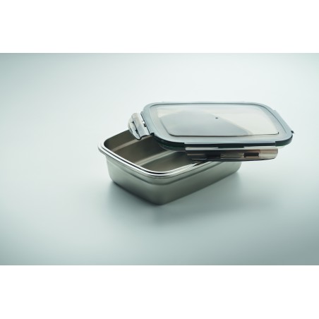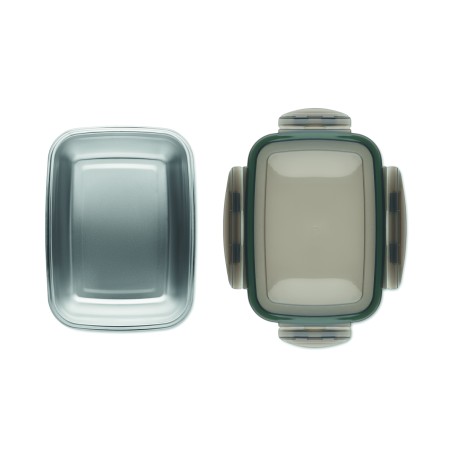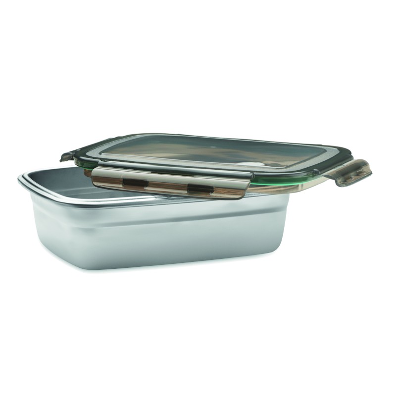 Boîte à lunch en acier inoxydable recyclé avec couvercle en PP et fermeture à fermoir sur 4 côtés. Capacité : 850 ml.