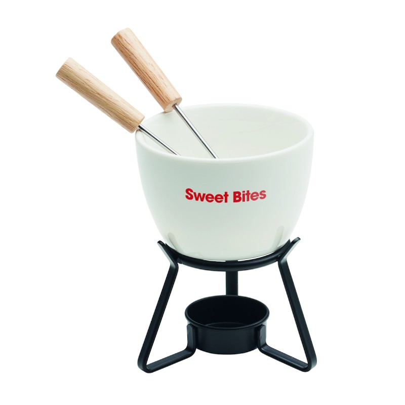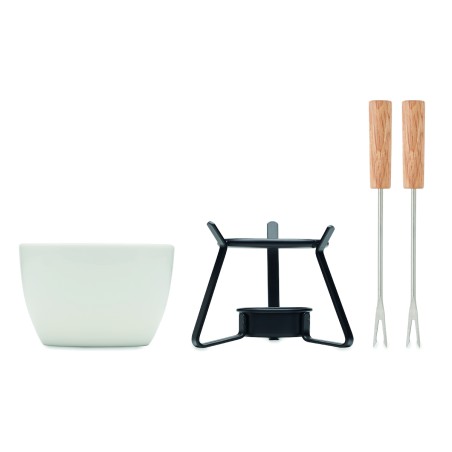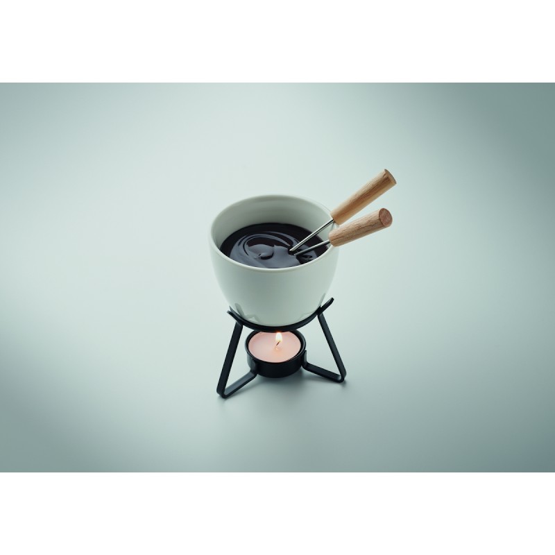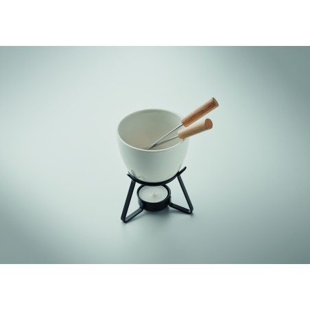 Petit service à fondue en céramique pour deux personnes. Comprend deux fourchettes en métal avec manches en bois. Bougie chauffe plat non incluse. Capacité : 240 ml.