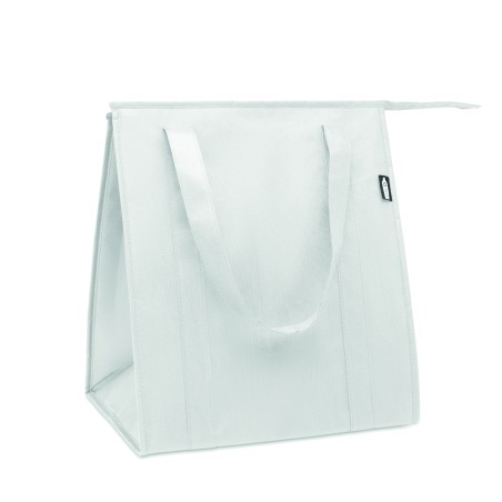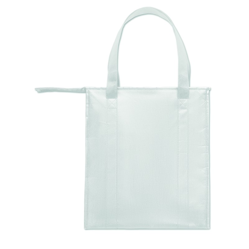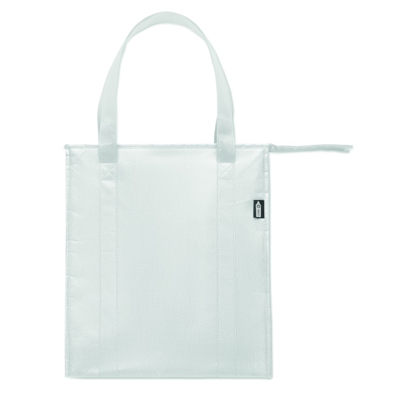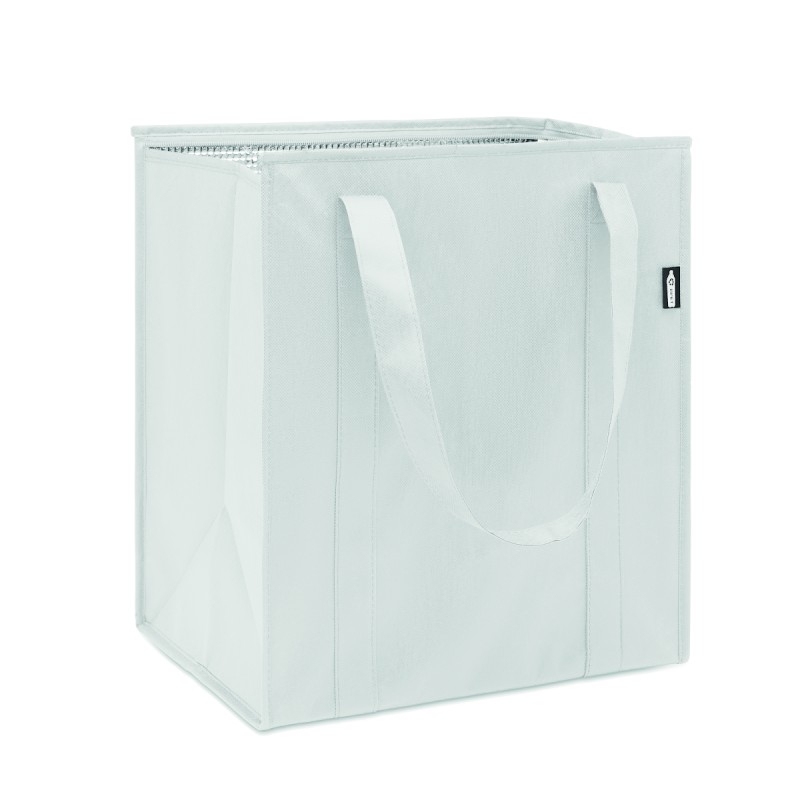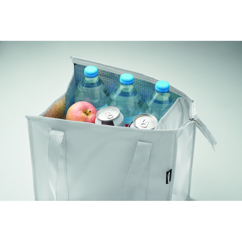 Sac isotherme en RPET non tissé 80gr/m². Matériau d'isolation : feuille d'aluminium. Capacité de 25 litres. Compartiment principal avec fermeture à glissière sur le dessus et fond renforcé amovible.