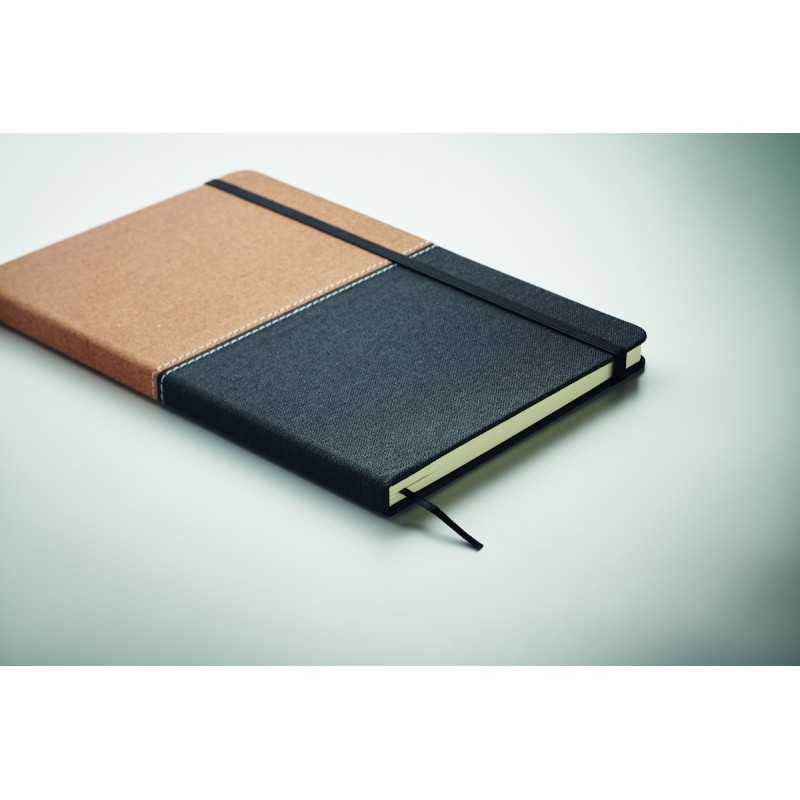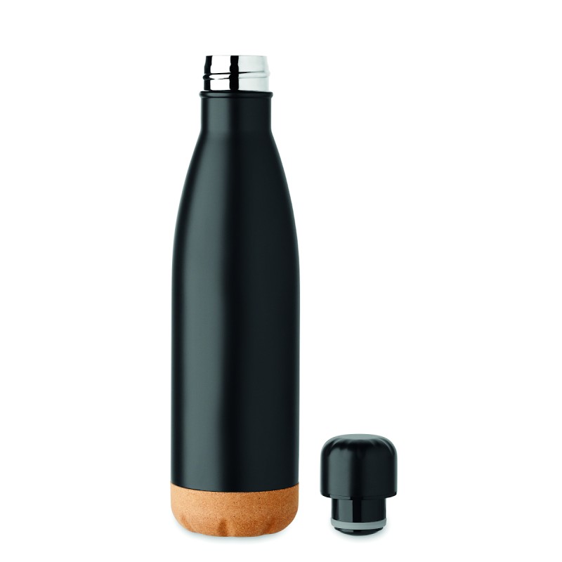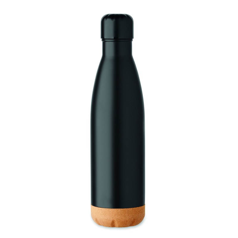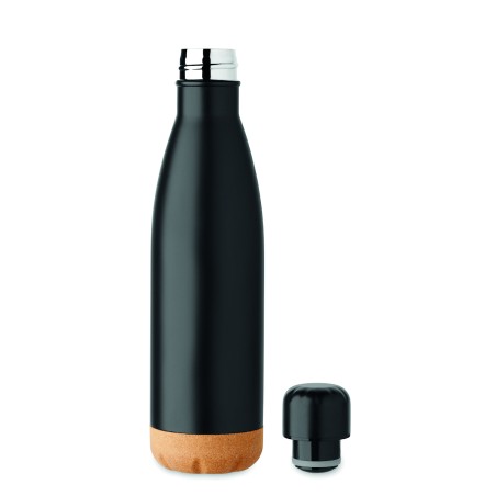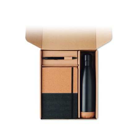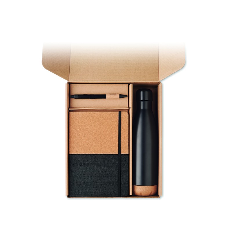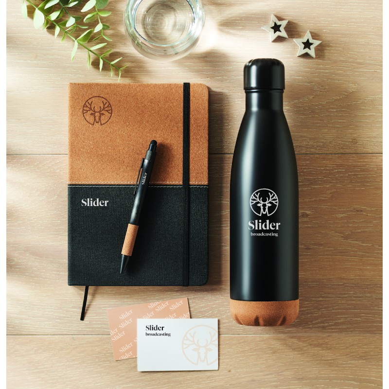 Coffret cadeau 3 pièces comprenant une bouteille isotherme en acier inoxydable à double paroi de 500 ml, un carnet A5 avec couverture rigide en RPET et liège, 160 pages lignées en papier recyclé (80 feuilles) et un stylo à bille en aluminium encre bleue. FSC®-certified | FSC MIX CREDIT, P7.1, N3.7, FSC-C213206
