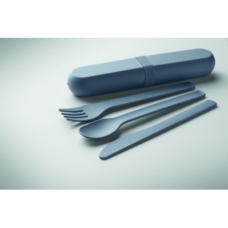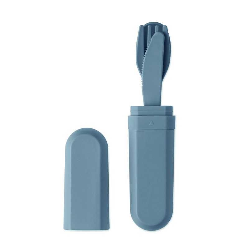 Set de couverts réutilisables avec étui en PLA de maïs. Chaque set comprend une fourchette, un couteau, une cuillère et un étui.