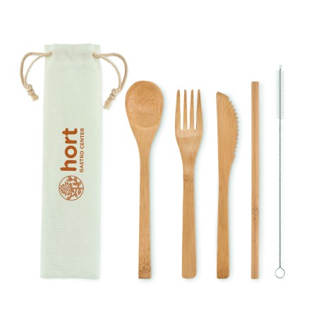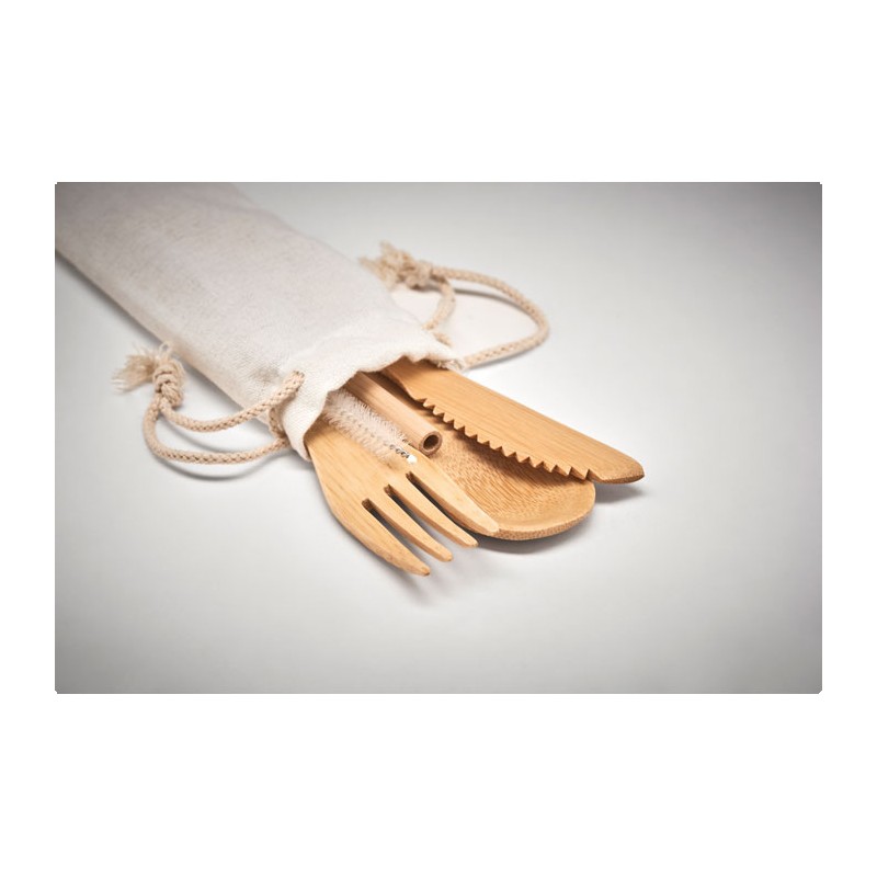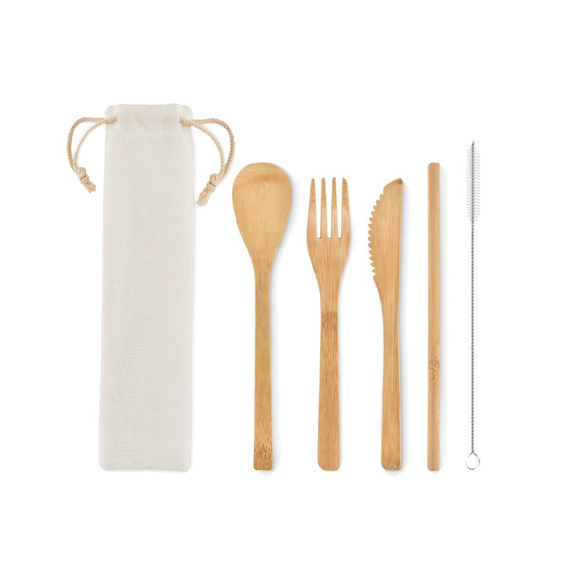 Ensemble de couverts en bambou réutilisables dans une pochette en toile. Comprend un couteau, une fourchette, une cuillère, une paille en bambou et un écouvillon en acier inoxydable. Le bambou est un produit naturel, et présente de légères variations de couleur, de décoration et de tailles.