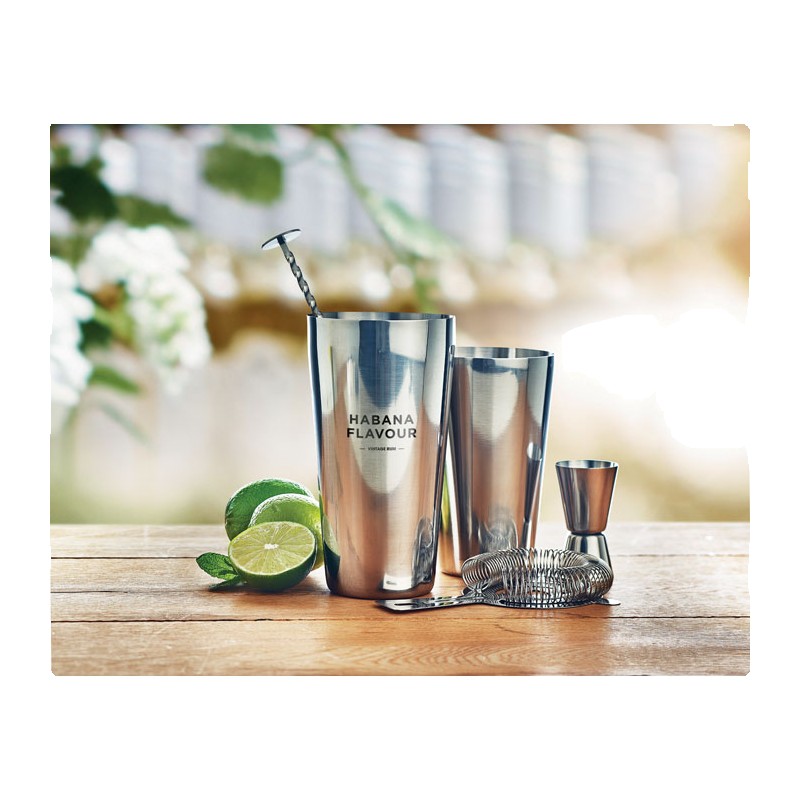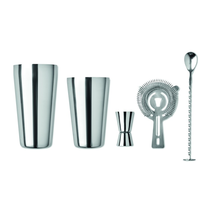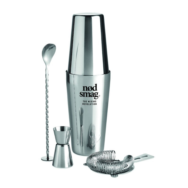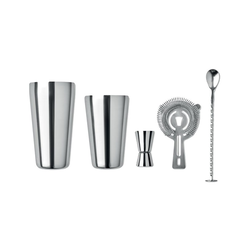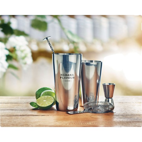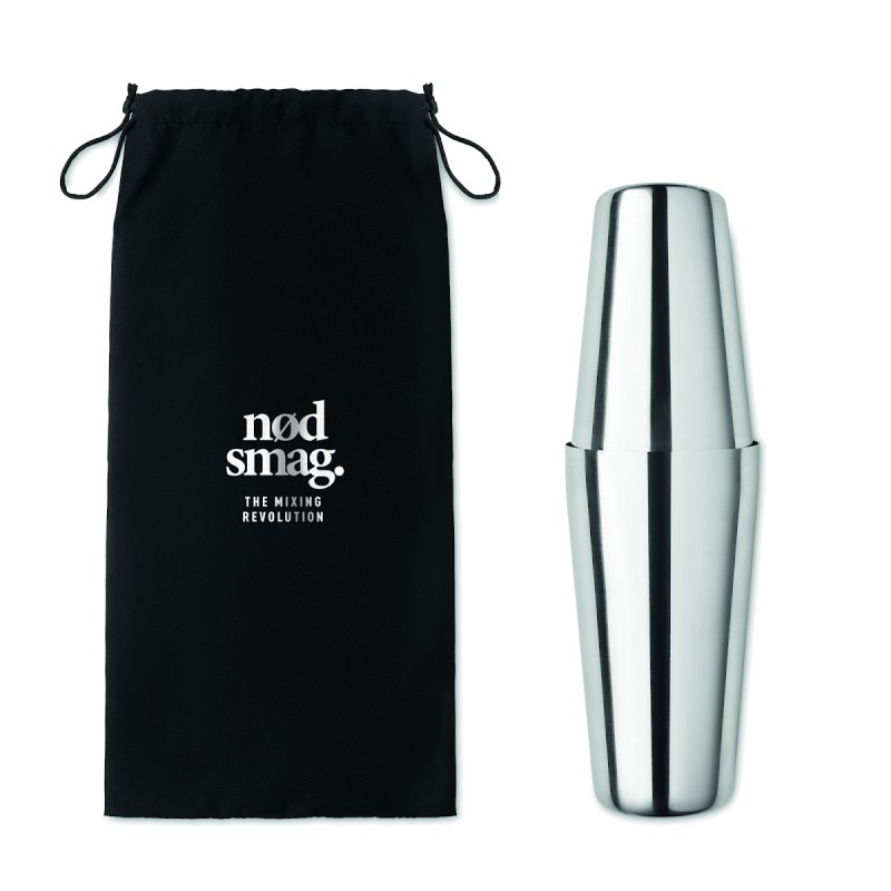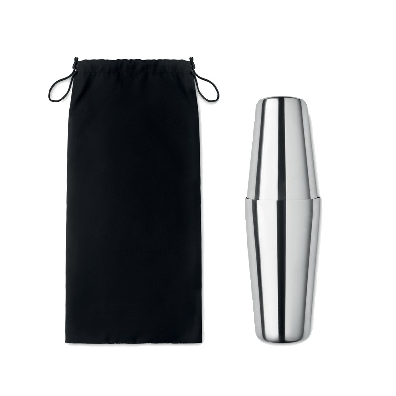Ensemble à cocktail en acier inoxydable comprenant un shaker de 750 ml, un pichet doseur (30 ml) et un tamis dans une pochette en coton.