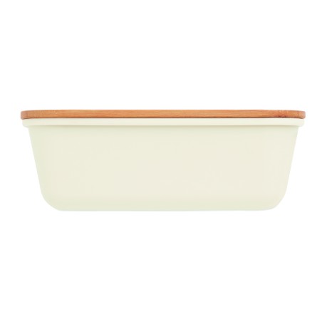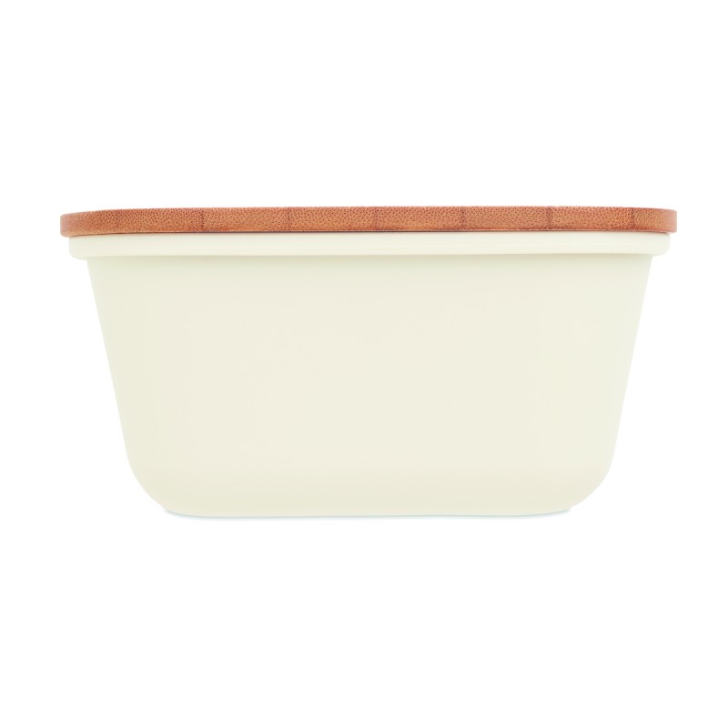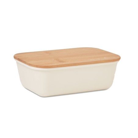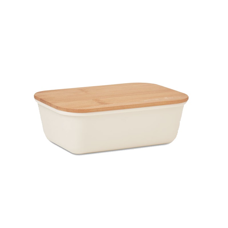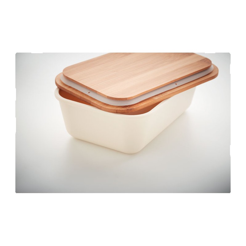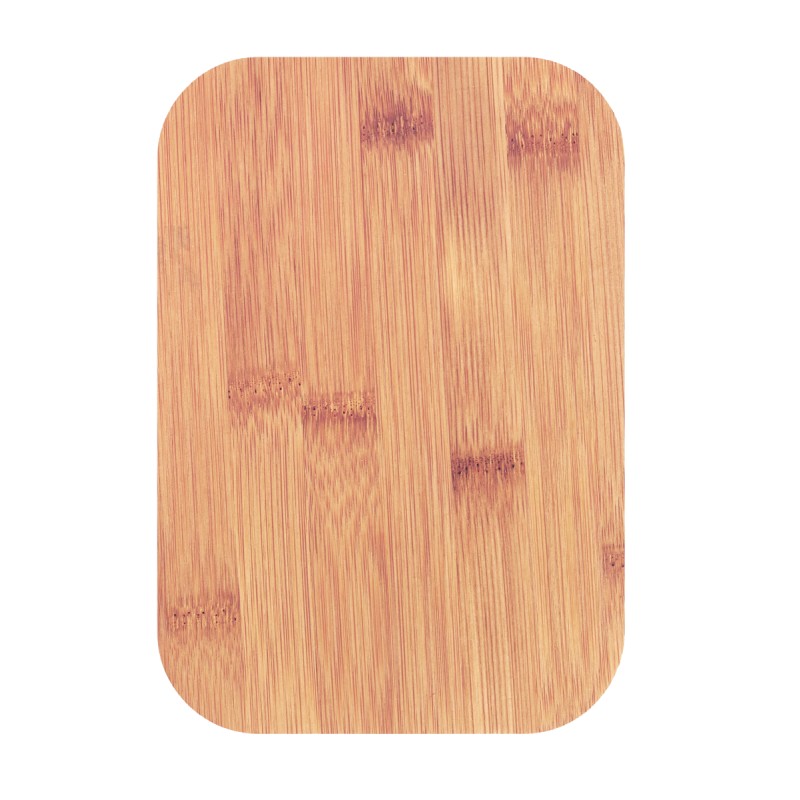 Boîte à lunch ou à sandwich en PP avec couvercle en bambou. Contenance : 1L. Le bambou est un produit naturel, et présente de légères variations de couleur, de décoration et de tailles.