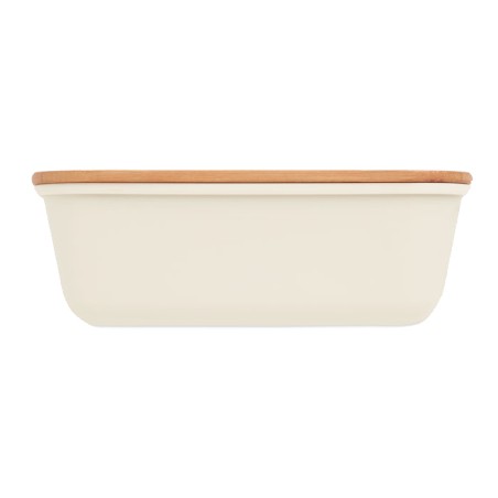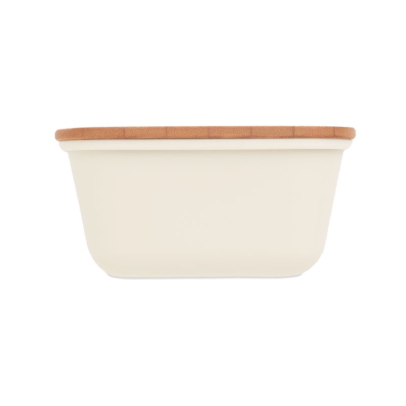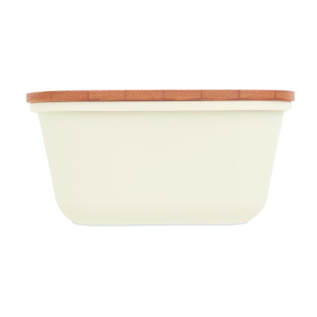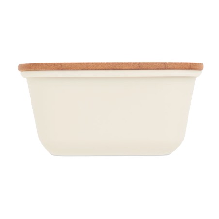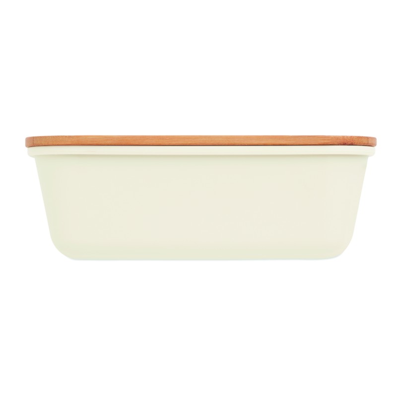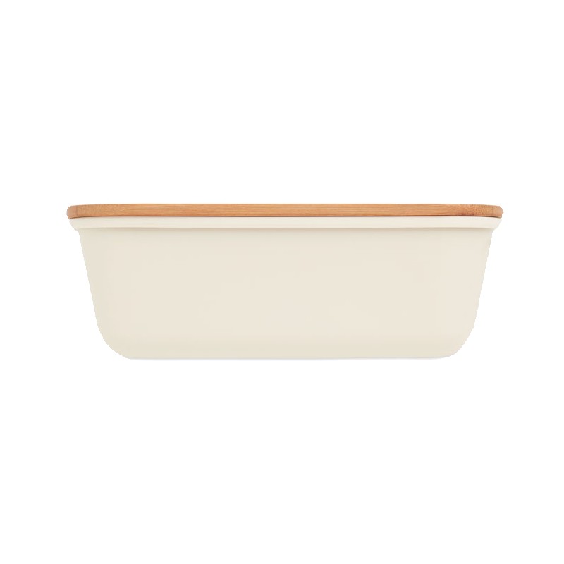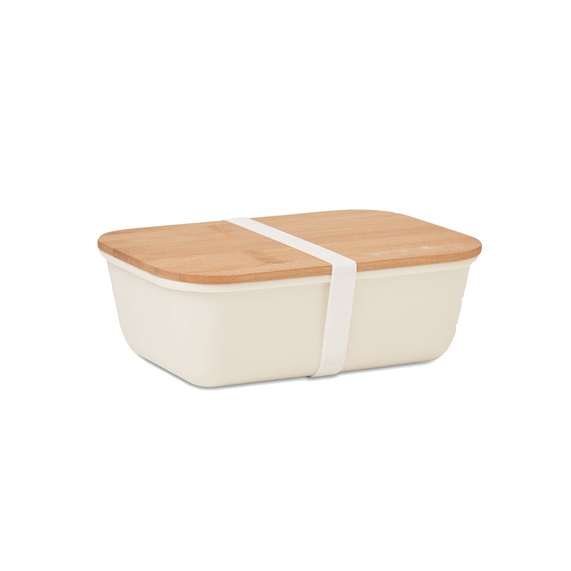 Boîte à lunch ou à sandwich en PP avec couvercle en bambou. Contenance : 1L. Le bambou est un produit naturel, et présente de légères variations de couleur, de décoration et de tailles.