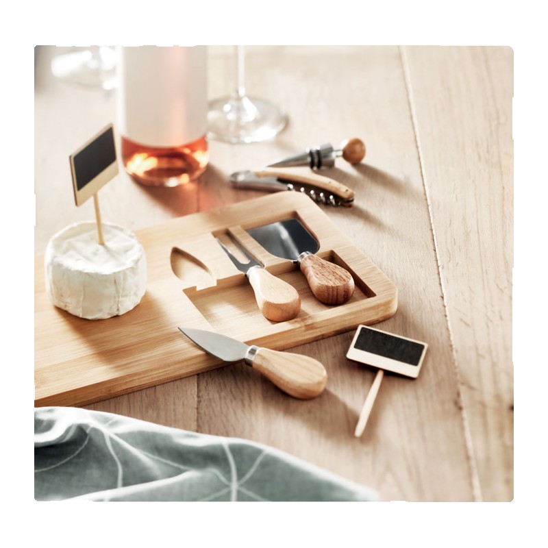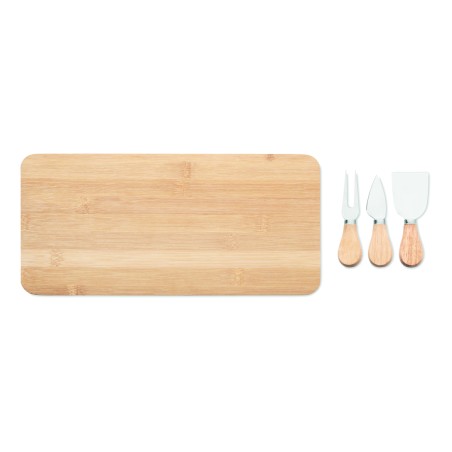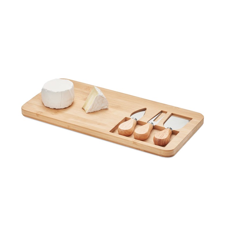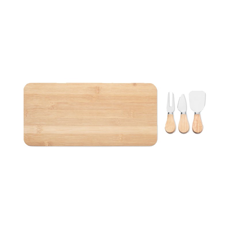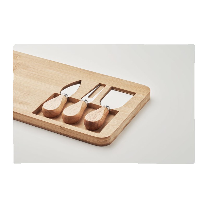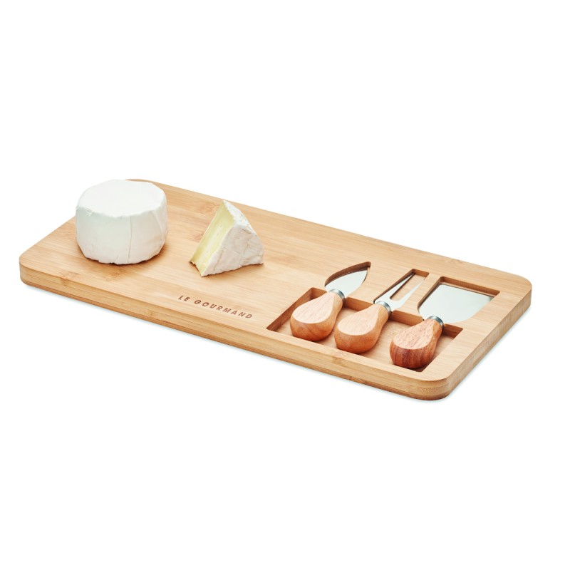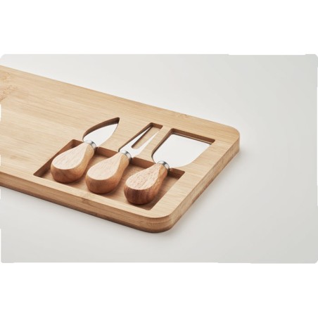 Set à fromage en bambou comprenant un plateau de service, 2 couteaux de service et une fourchette. Présentez un plateau de fromage avec style grâce à cette planche en bois à l'aspect naturel et aux ustensiles assortis. Peut également être utilisé pour servir d'autres types d'aliments et d'en-cas lors de fêtes ou d'un dîner. Le bambou est un produit naturel, il peut y avoir de légères variations de couleur et de taille par article, ce qui peut affecter le résultat final de la décoration. FSC®-certified | FSC 100%, N5.7, FSC-C213206