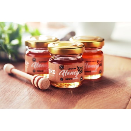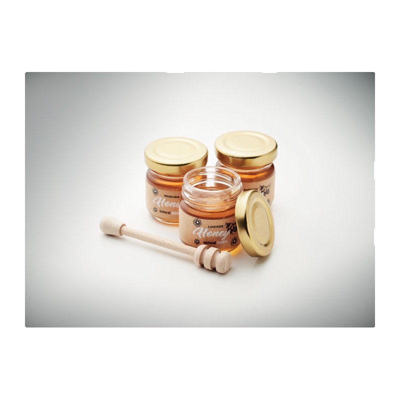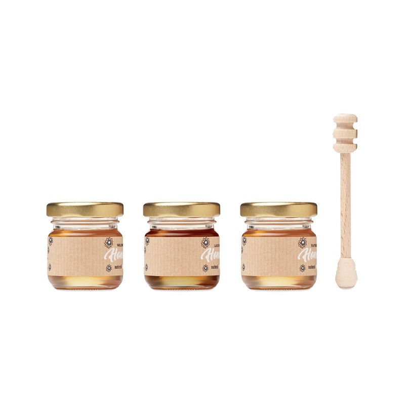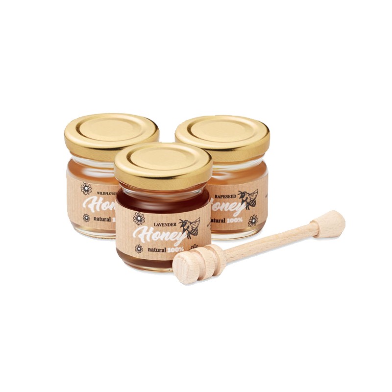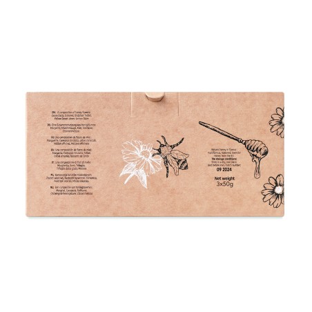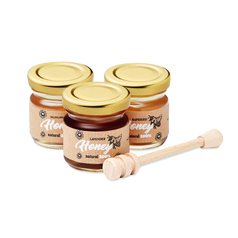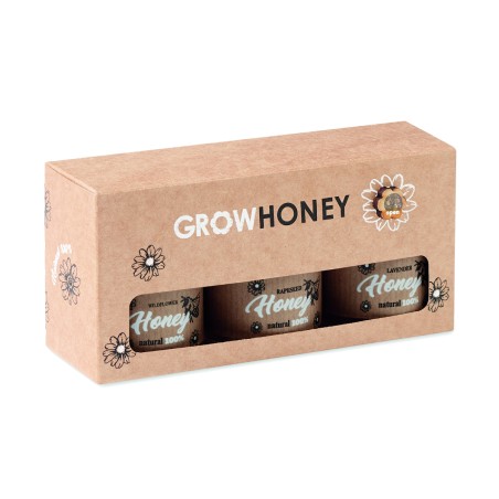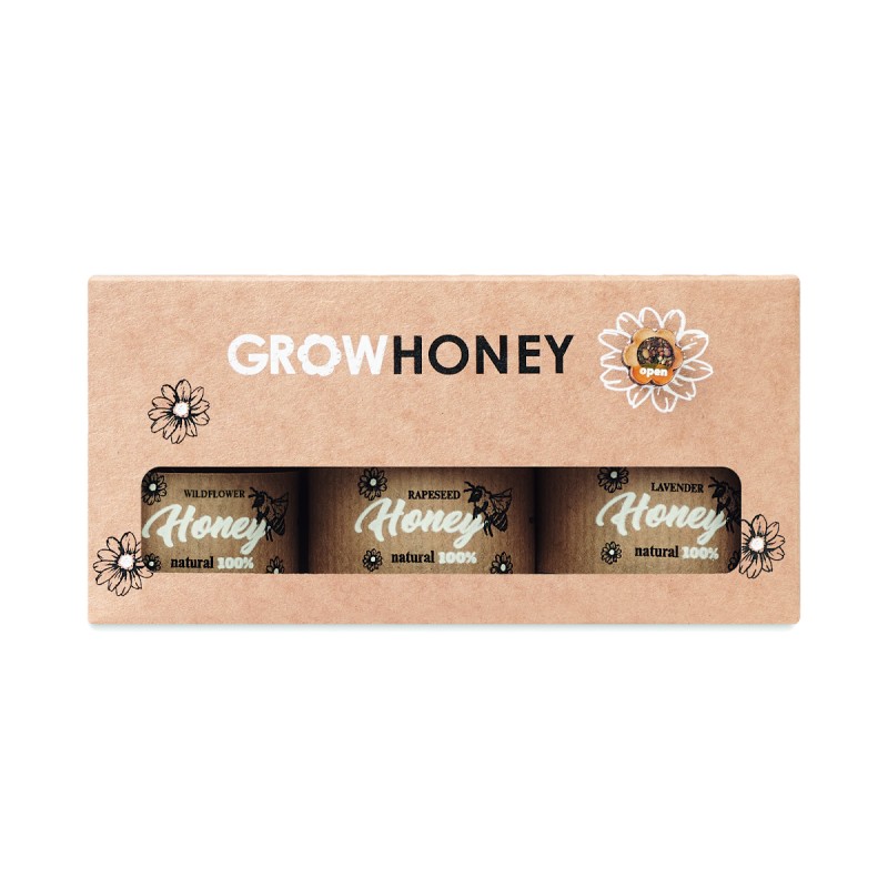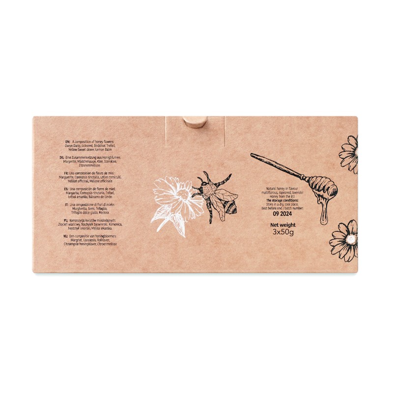 Sélection de 3 pots de miel naturel avec une cuillère à miel en bois. ( Mille fleurs; lavande et colza : 50g chacun). Livré dans une boîte en papier kraft. Incluant des graines de fleurs sauvages. Fabriqué dans l'UE.