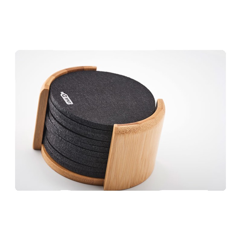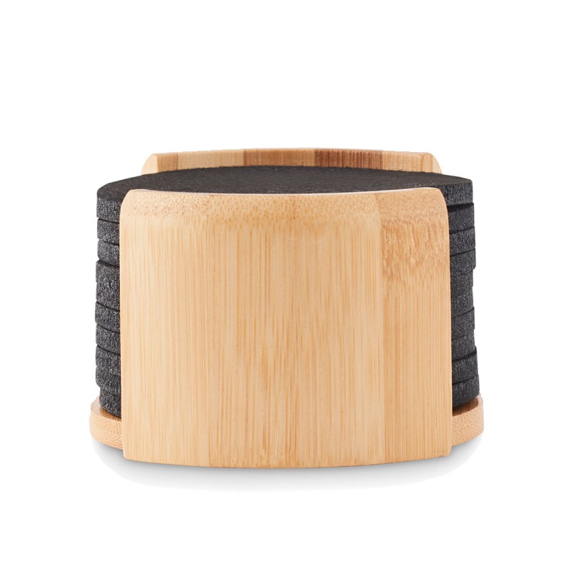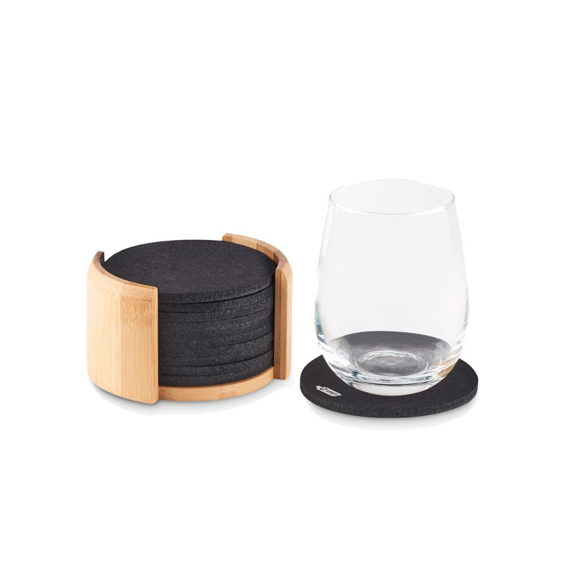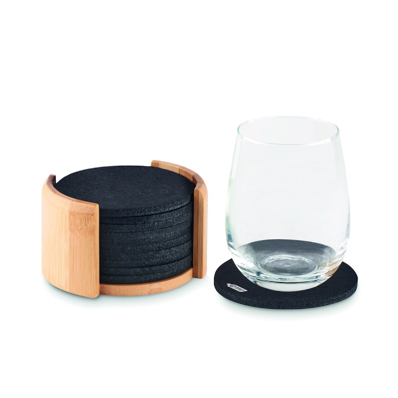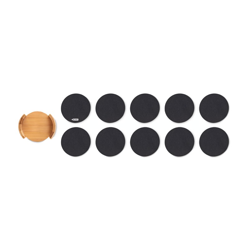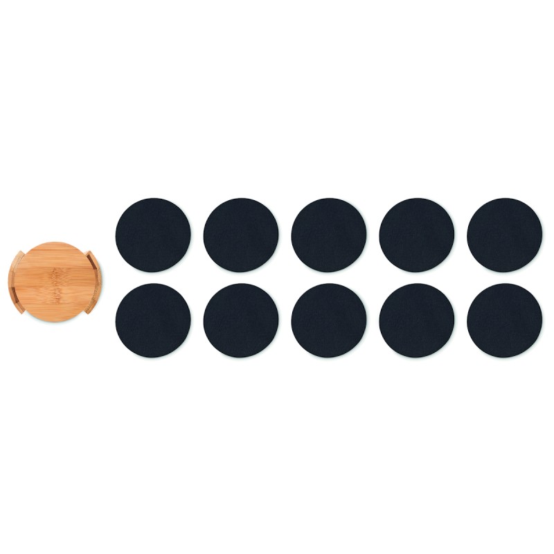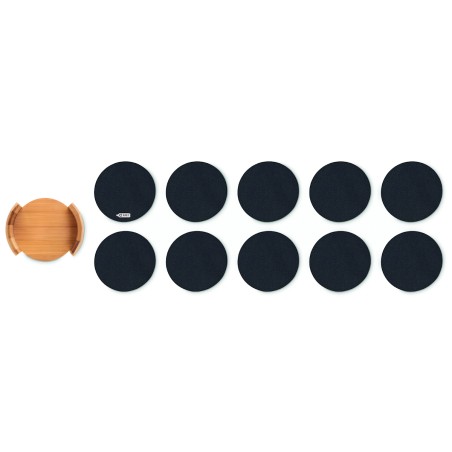 Lot de 10 sous-verres en feutre RPET présentés dans un support en bambou. Le bambou est un produit naturel, et présente de légères variations de couleur, de décoration et de tailles.