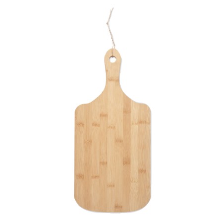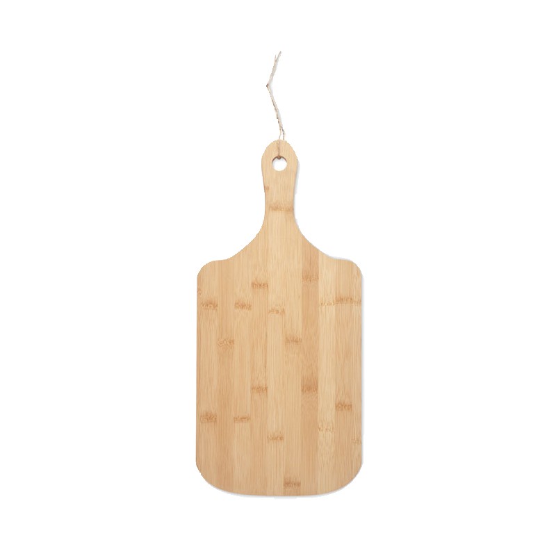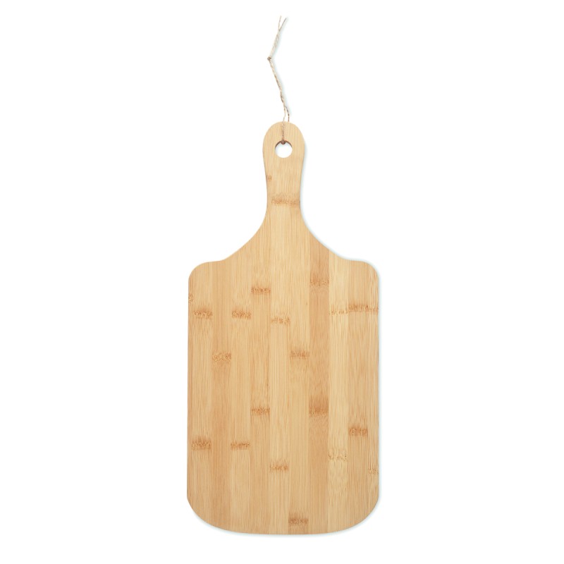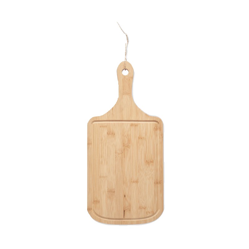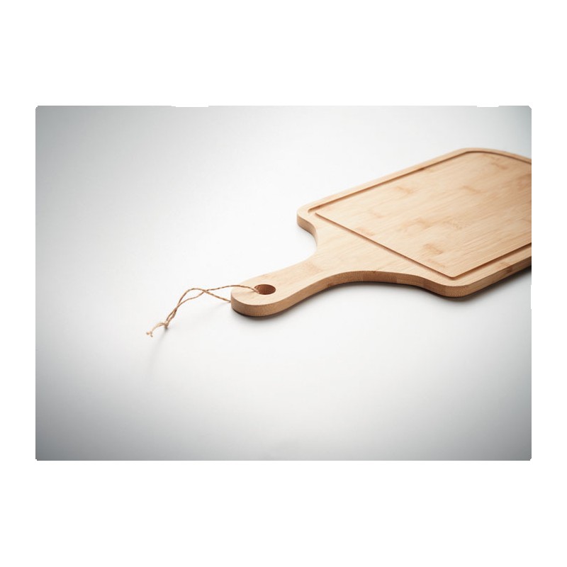 Planche de service en bambou avec rainure et corde de jute en forme naturelle. Le bambou est un produit naturel, et présente de légères variations de couleur, de décoration et de tailles.