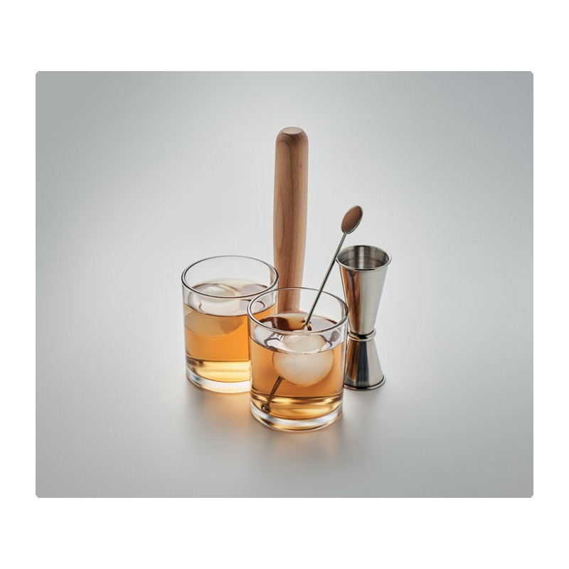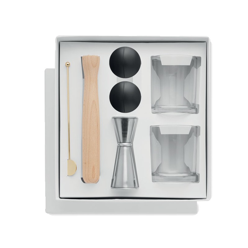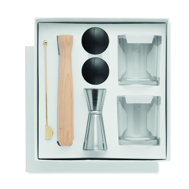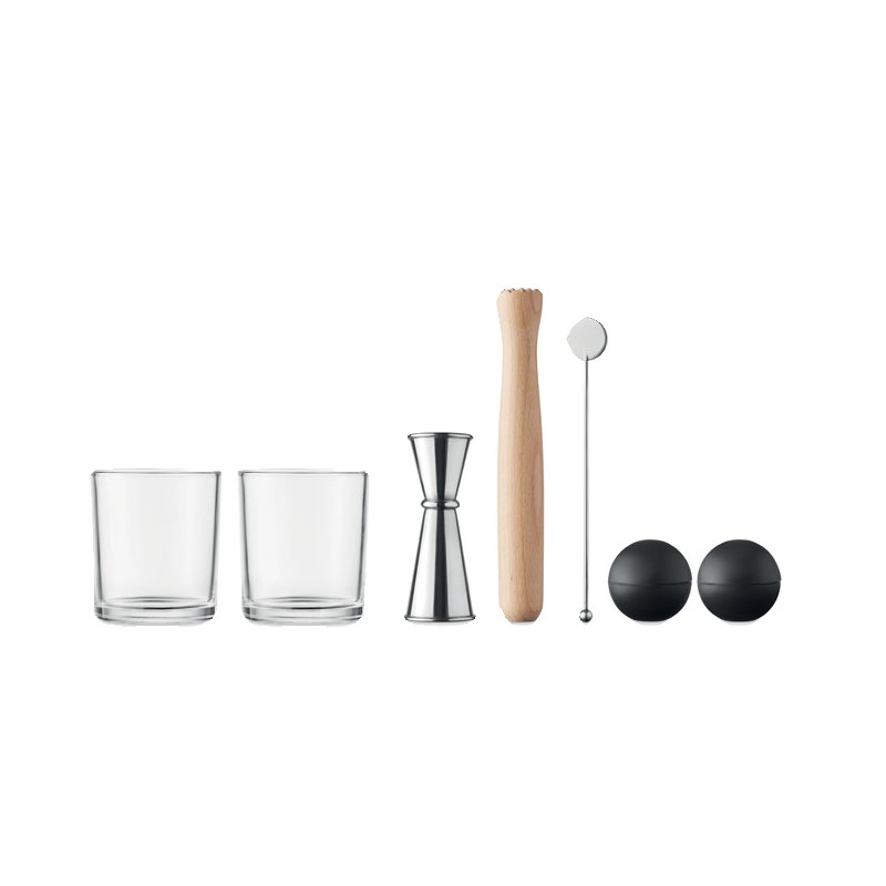 Set de verres à cocktail. Comprend 7 pièces : deux gobelets, un doseur double face en acier inoxydable (25&50 ml), un mélangeur en bois, un agitateur en acier inoxydable et deux moules à glace sphériques en silicone.