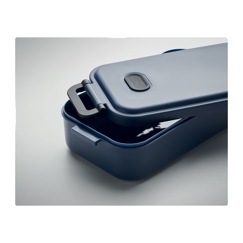 Boîte à lunch en PP avec couvercle hermétique, valve en silicone et deux boucles latérales. Capacité : 800 ml.