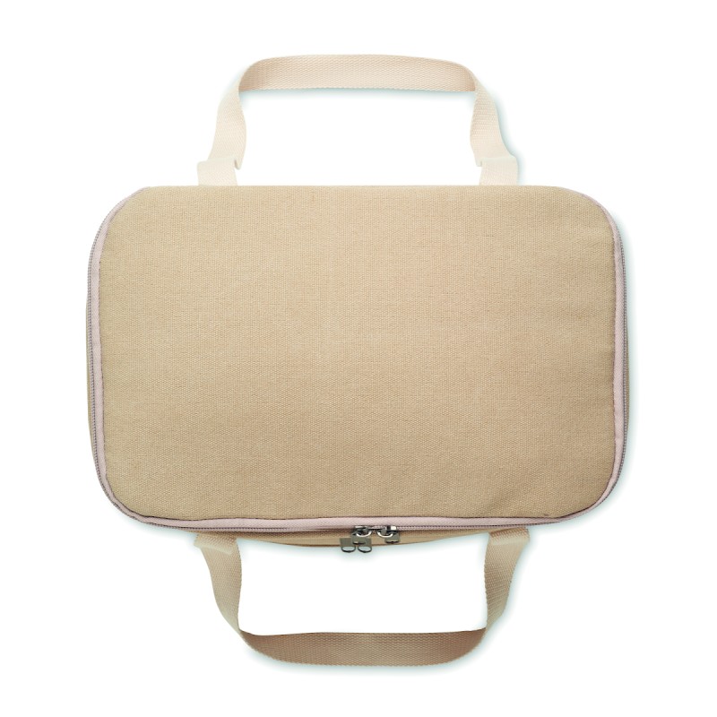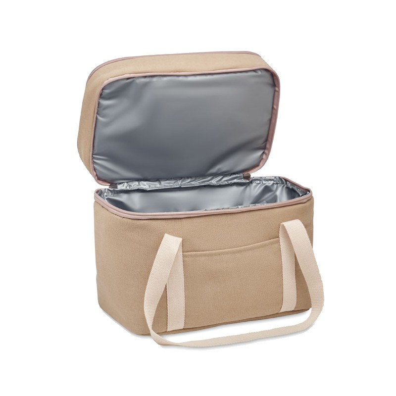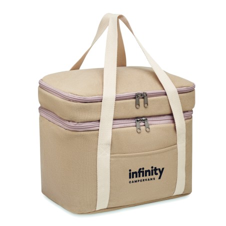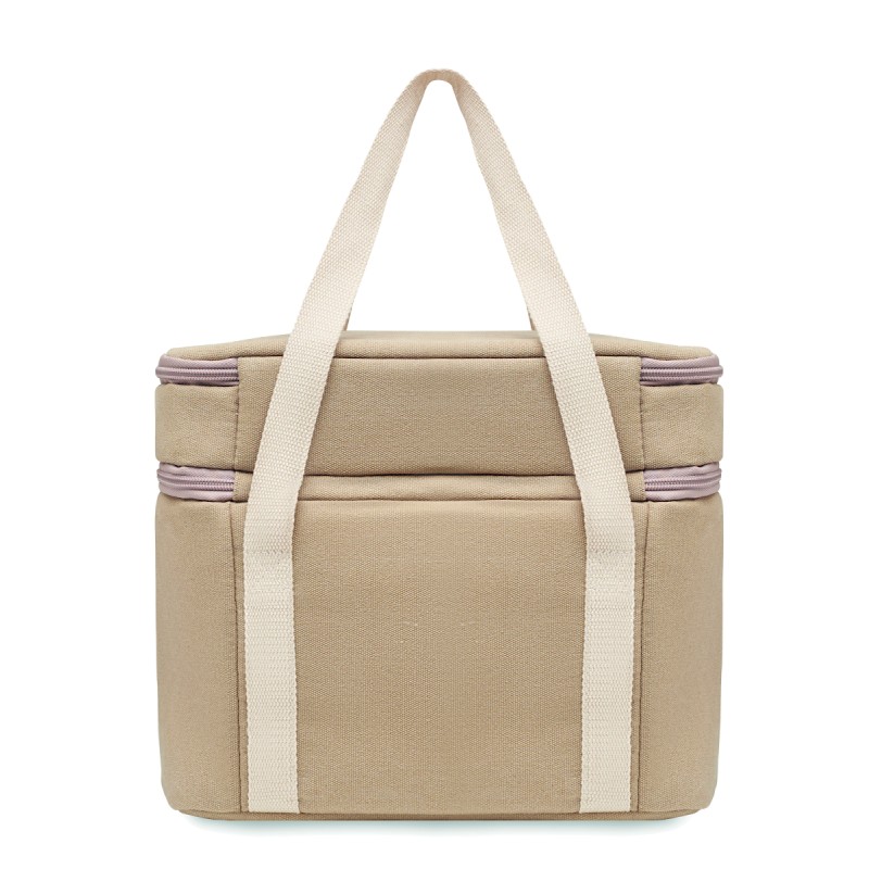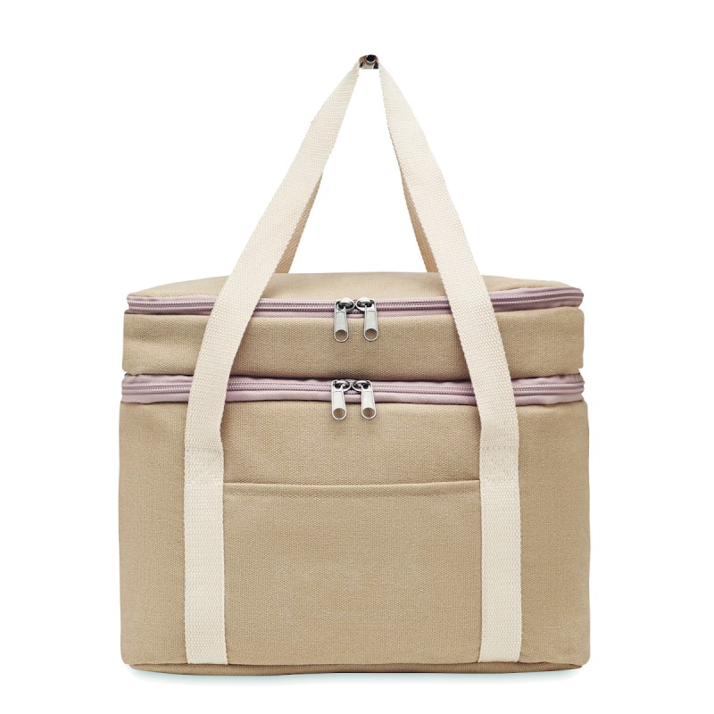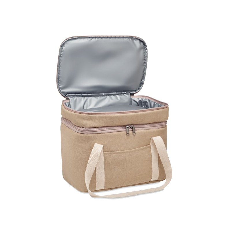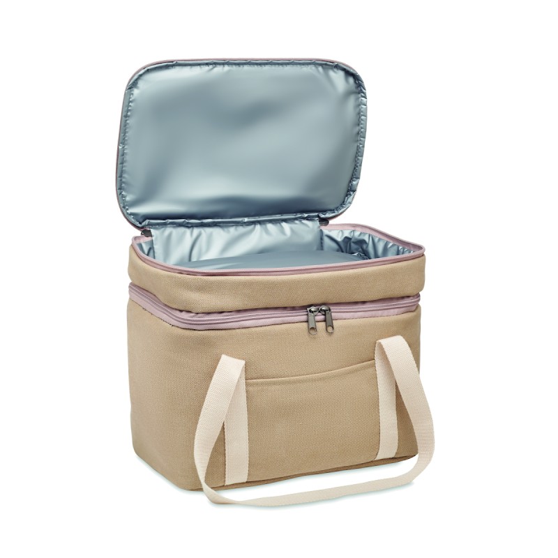Sac isotherme avec 2 compartiments en toile lavée avec sangle en coton. 320 gr/m². Isolation : PEVA 15C avec mousse PE 6mm.