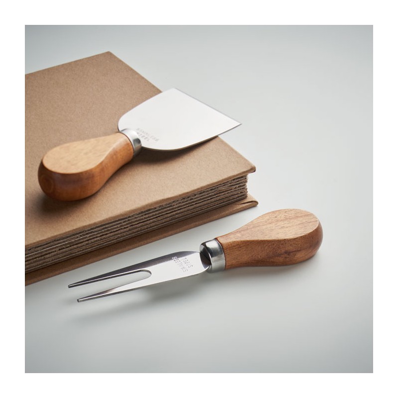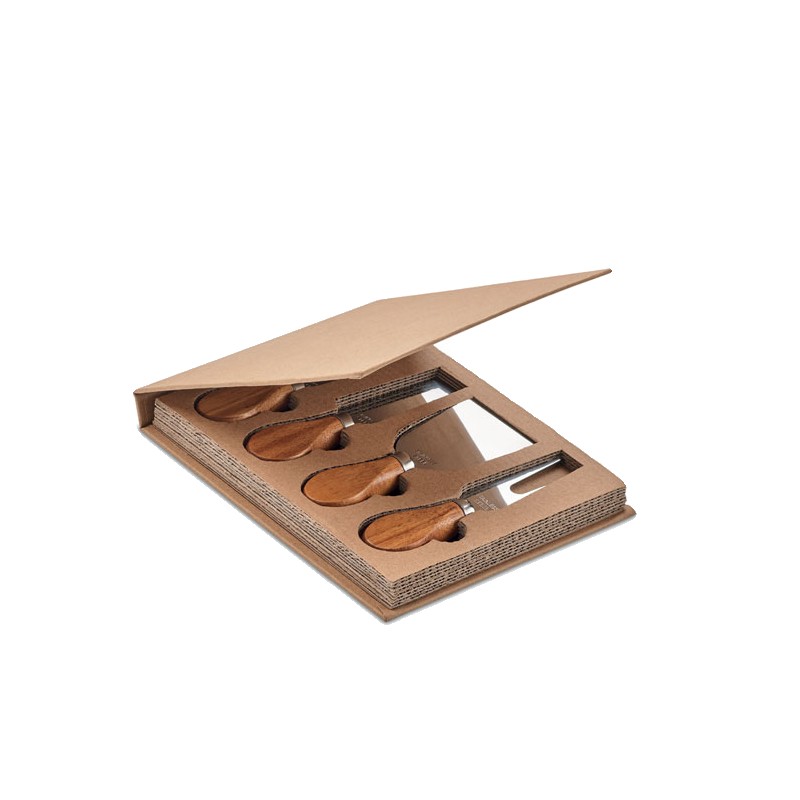 Set de 4 couteaux à fromage en acier inoxydable et manches en bois d'hévéa. Présenté dans une boîte cadeau en carton. Le bois est un produit naturel, et présente de légères variations de couleur, de décoration et de tailles.