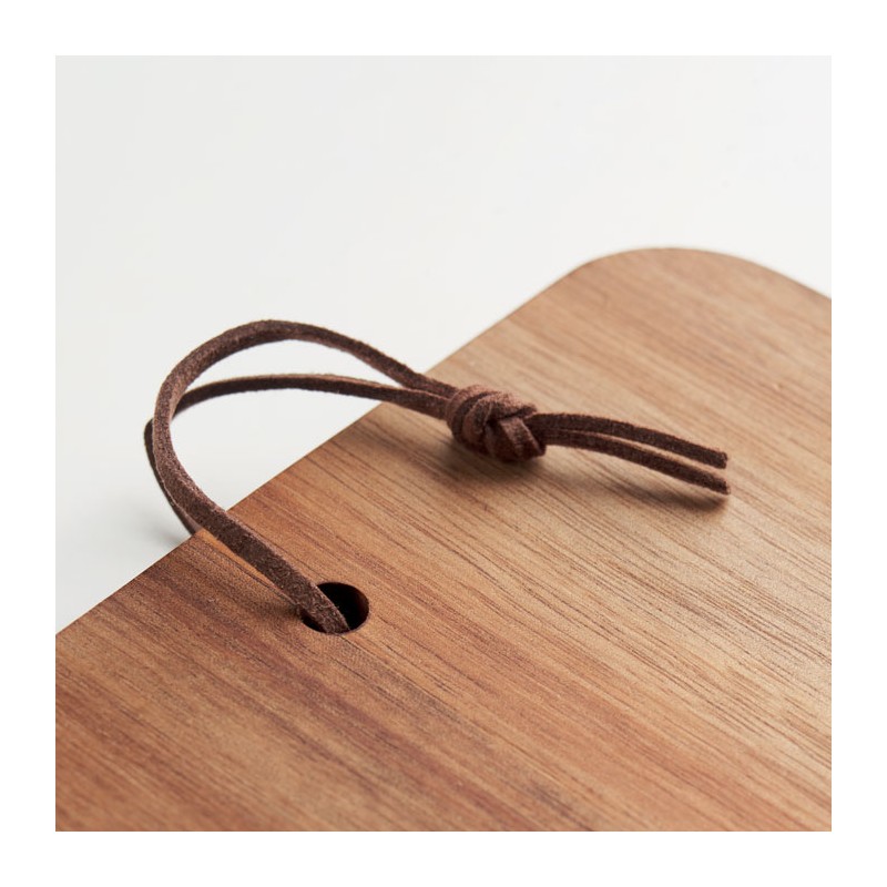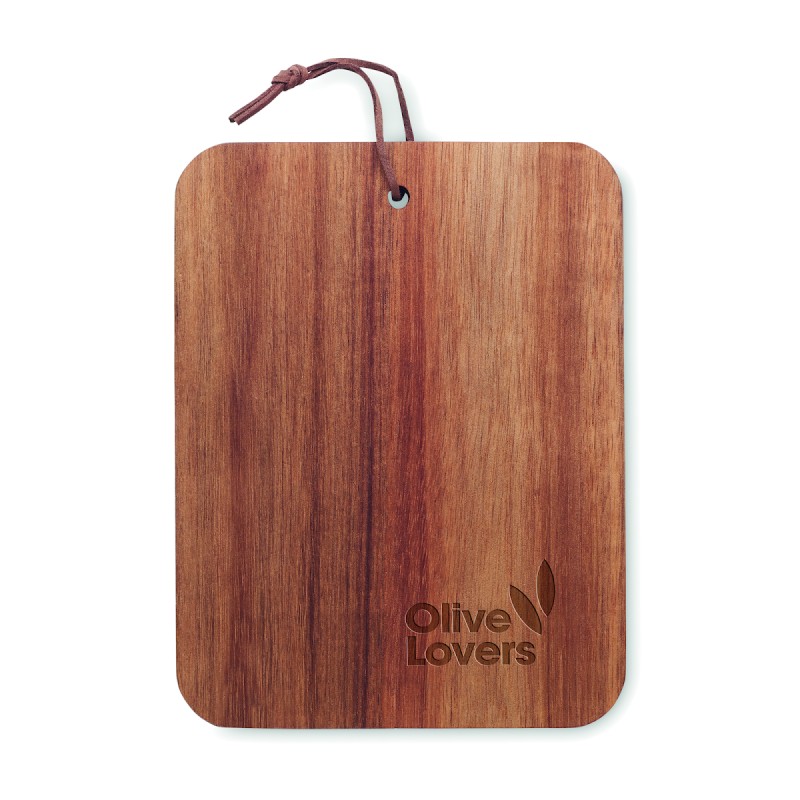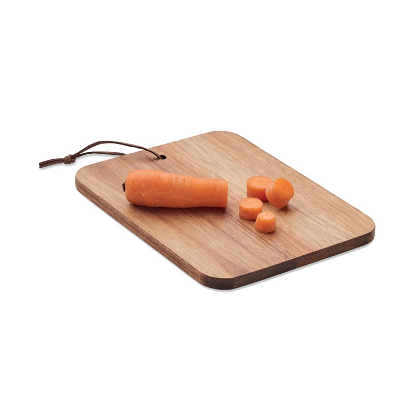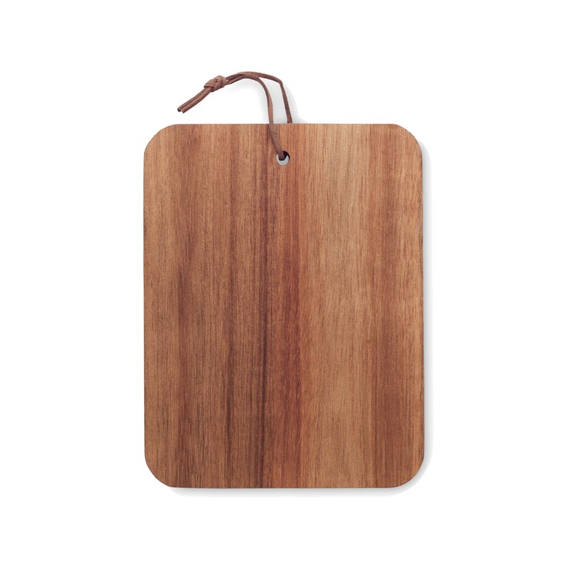 Planche à découper en bois d'acacia avec cordon en PU. Le bois est un produit naturel, et présente de légères variations de couleur, de décoration et de tailles.