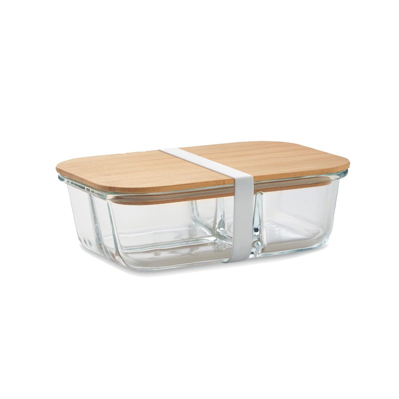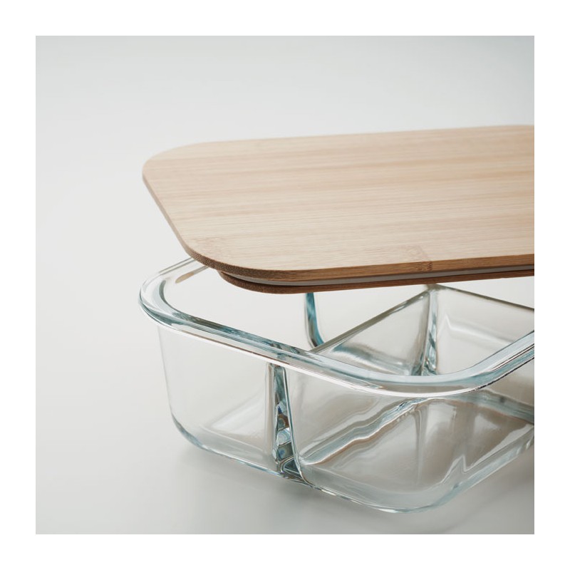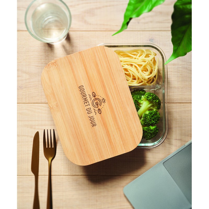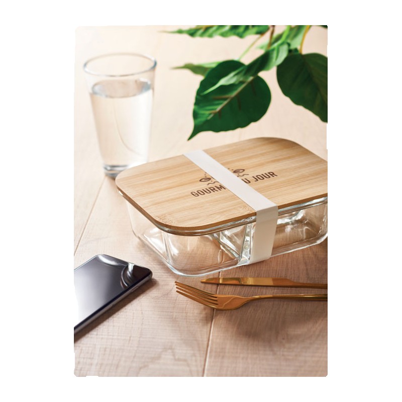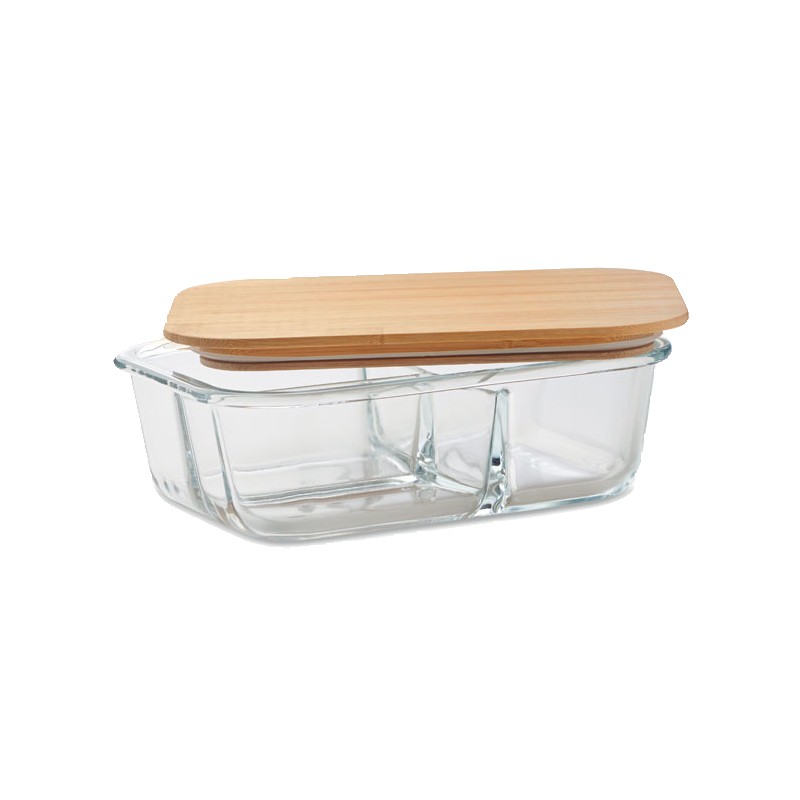 Lunchbox 800 ml en verre borosilicate 3 compartiments, couvercle en bambou et bande silicone. Le bambou est un produit naturel, possibilité de variations de couleur et taille d'un article à l'autre. Le bambou est un produit naturel, et présente de légères variations de couleur, de décoration et de tailles.