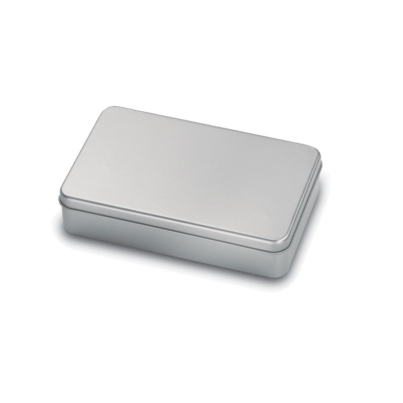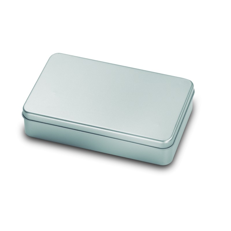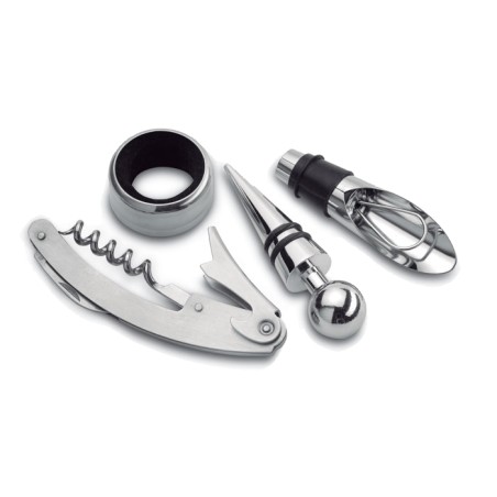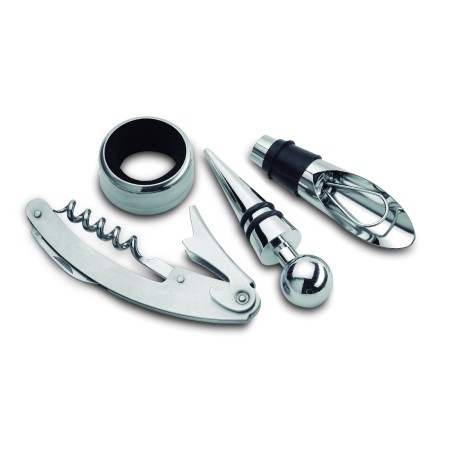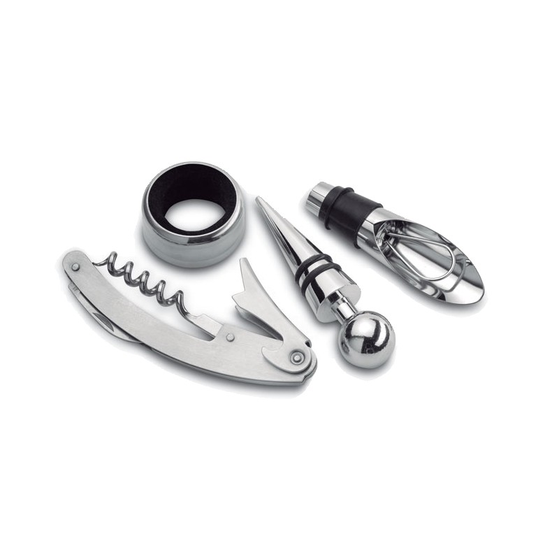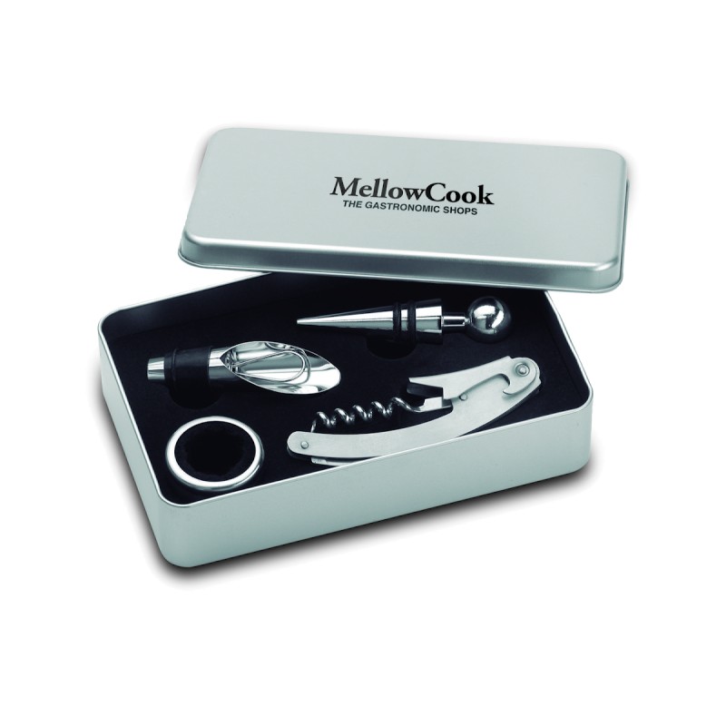 Ensemble d'accessoires 4 pièces comprenant un tire-bouchon, un bouchon, un bec verseur et un anneau anti-gouttes présenté dans une boîte en fer blanc.