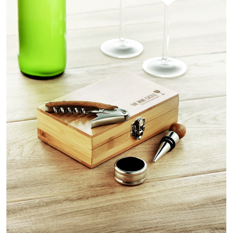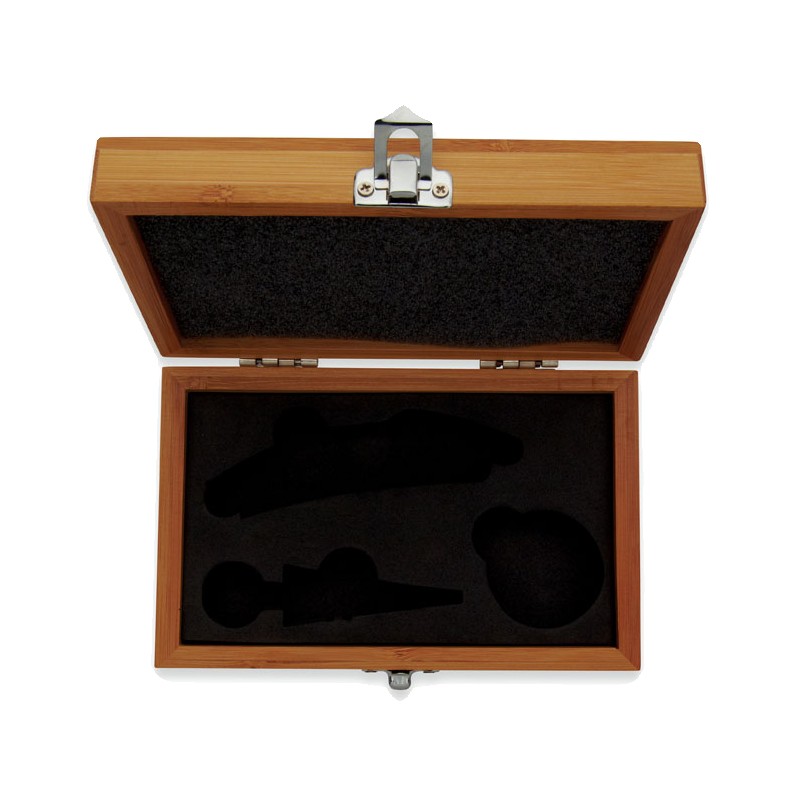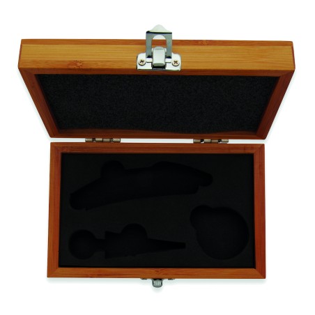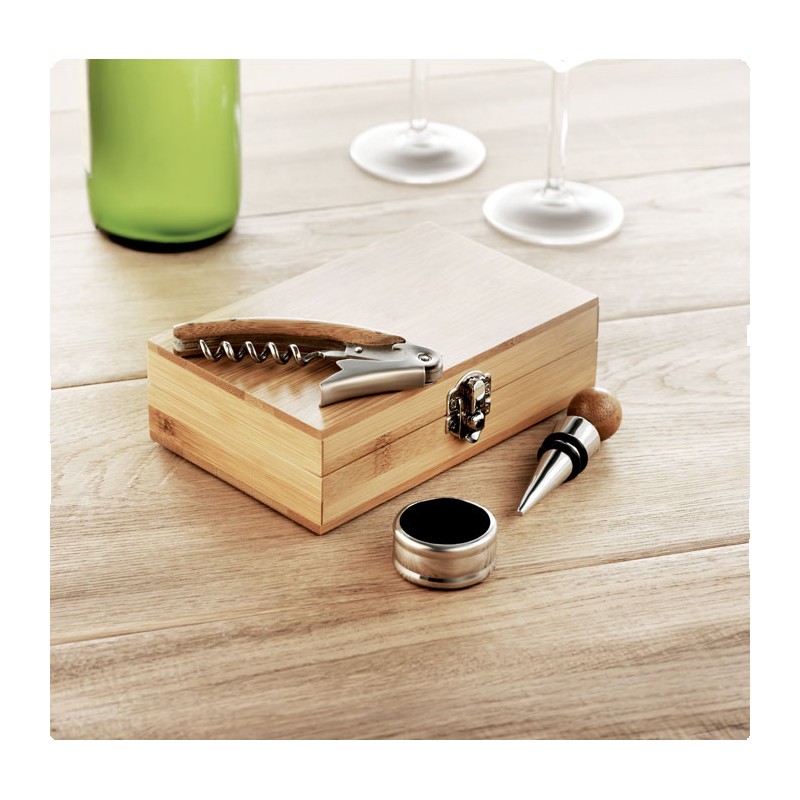 Coffret de sommelier en bambou comprenant un tire-bouchon, un anti-goutte et un bouchon en acier inoxydable et en bambou. Le bambou est un produit naturel, et présente de légères variations de couleur, de décoration et de tailles.