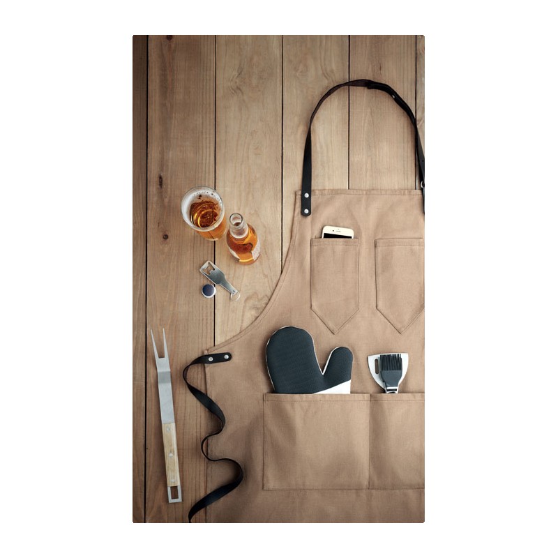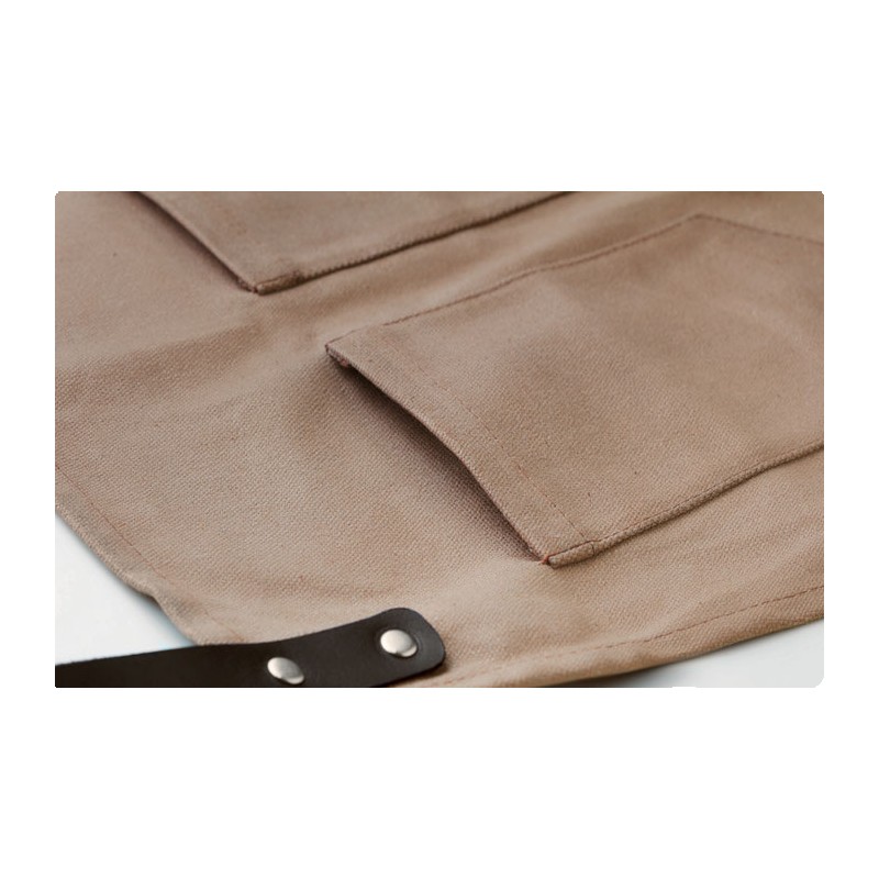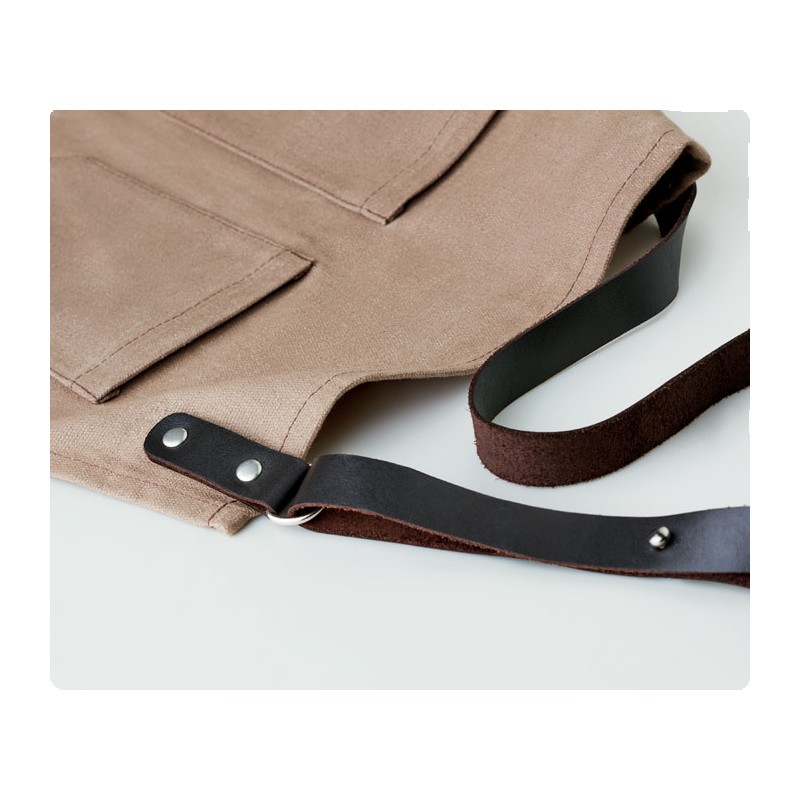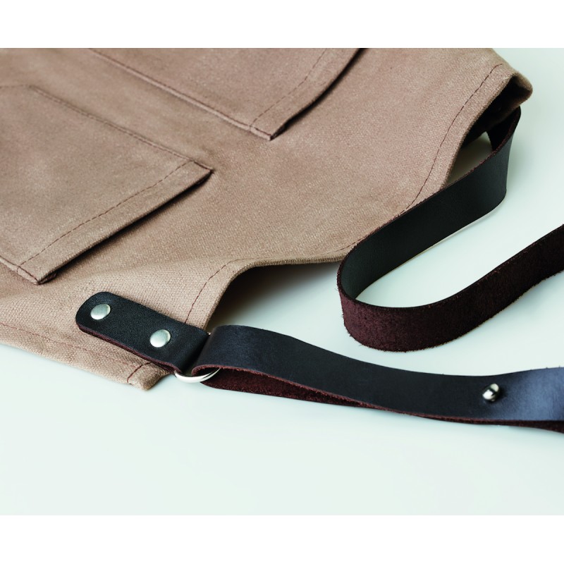 Tablier en toile enduite et attributs en cuir, deux poches cœur et une grande poche devant, bandouliere ajustable.