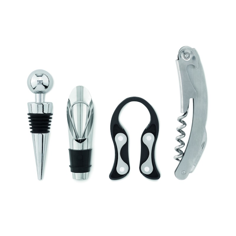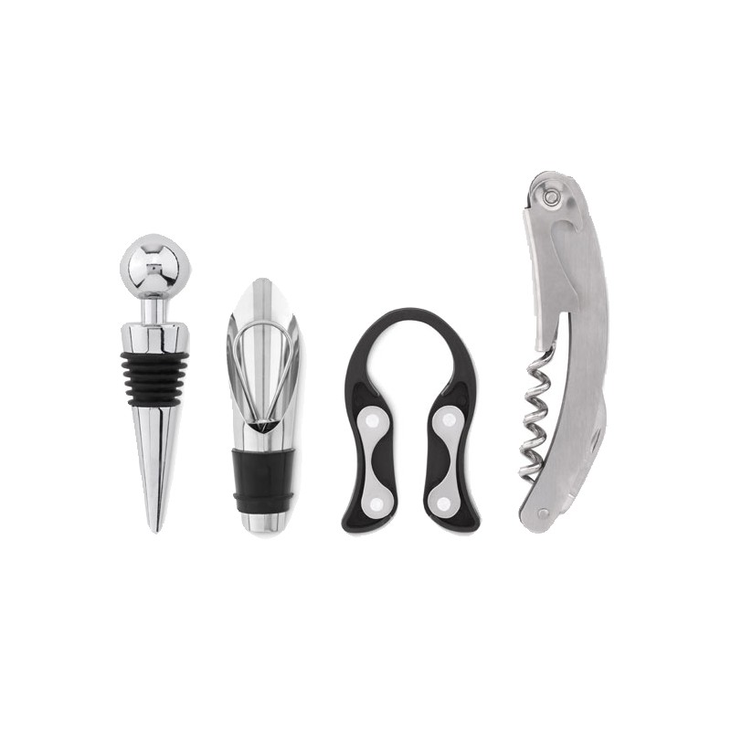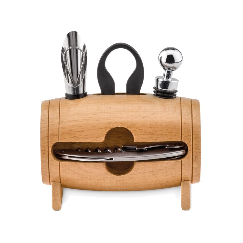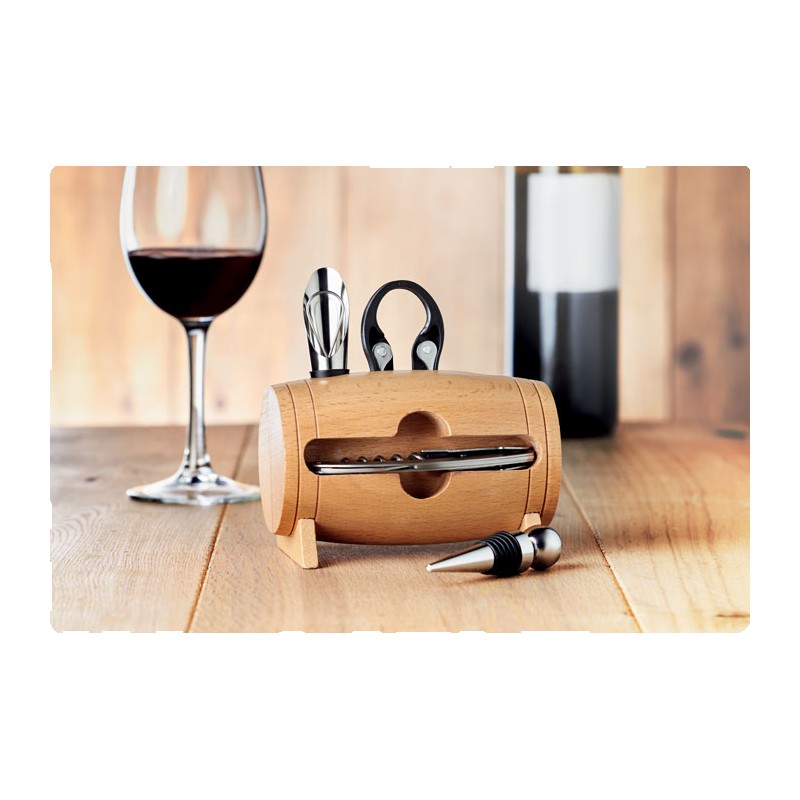 Mini tonneau en bois avec 4 accessoires à vin. Limonadier, bouchon à vin, verseur de vin avec bouchon et coupe capsule.