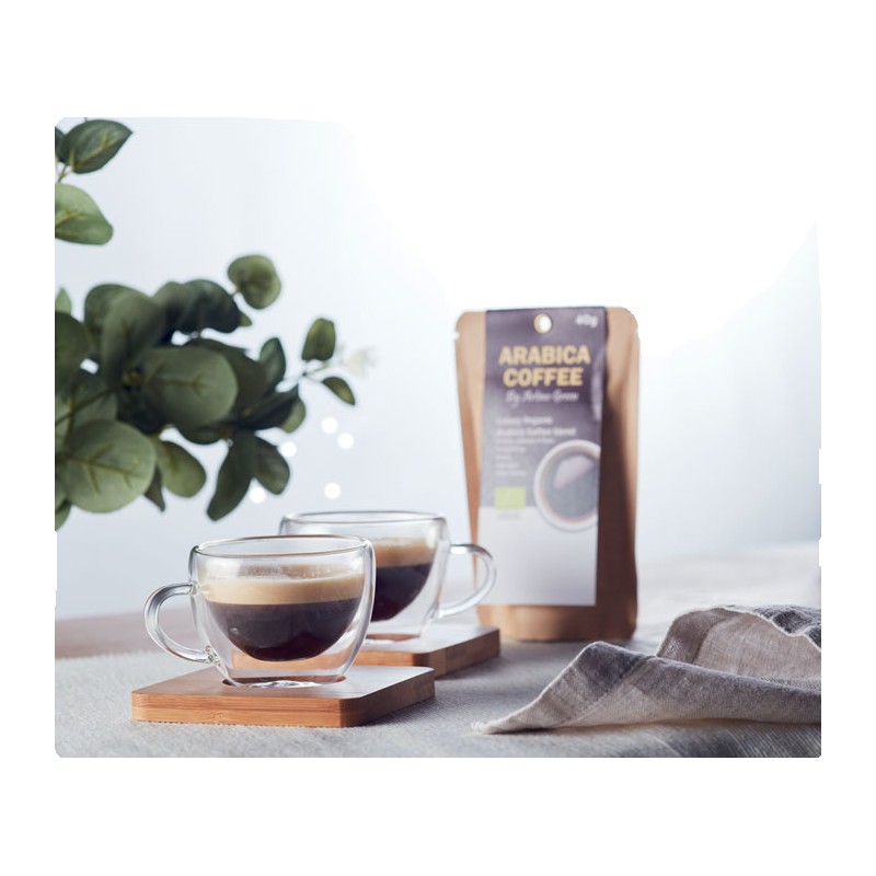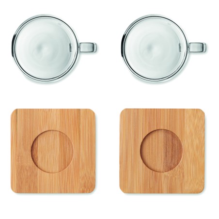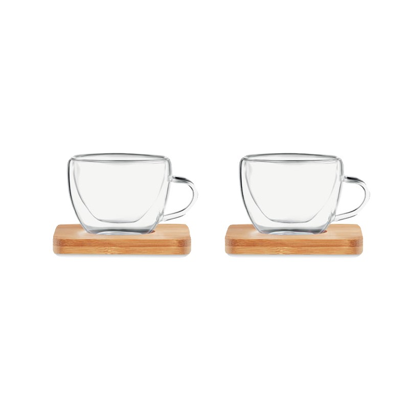 Ensemble de 2 verres à expresso à double paroi avec soucoupe en bambou. Présenté dans une boîte en papier kraft. Capacité 60 ml. Le bambou est un produit naturel, et présente de légères variations de couleur, de décoration et de tailles.