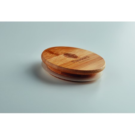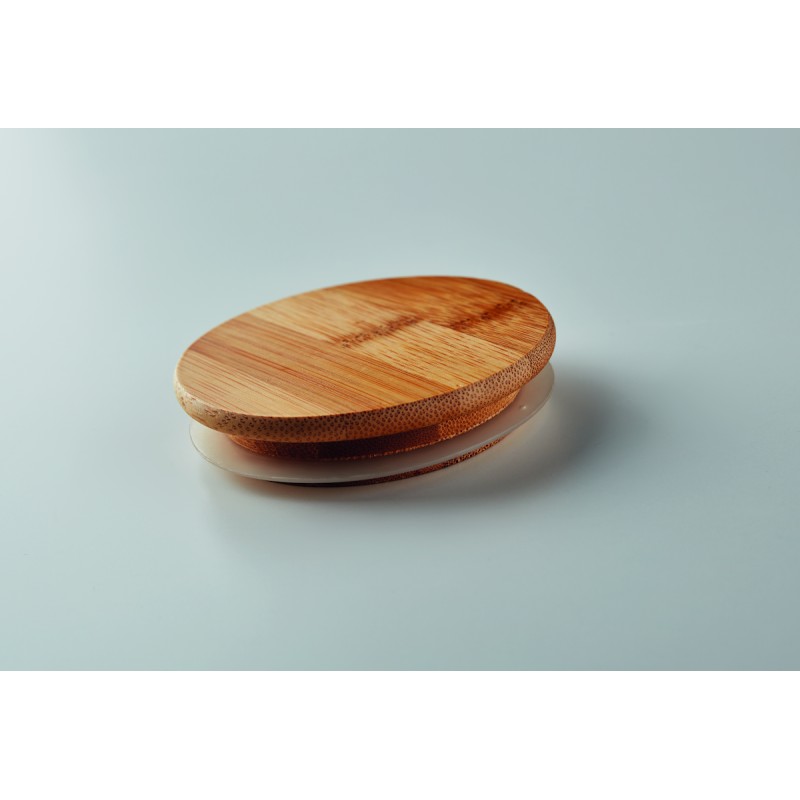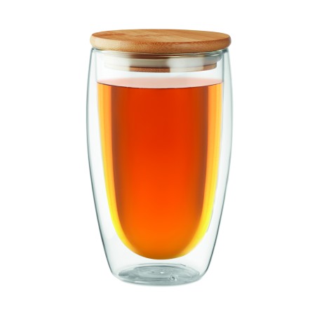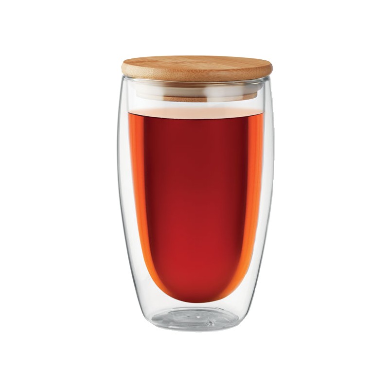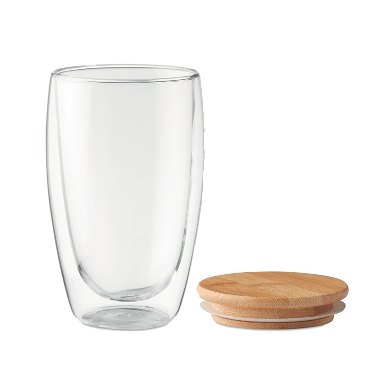 Verre borosilicate à double paroi avec couvercle en bambou et anneau en silicone. Contenance 450 ml. Le bambou est un produit naturel, et présente de légères variations de couleur, de décoration et de tailles. Ne pas laver au lave-vaisselle.