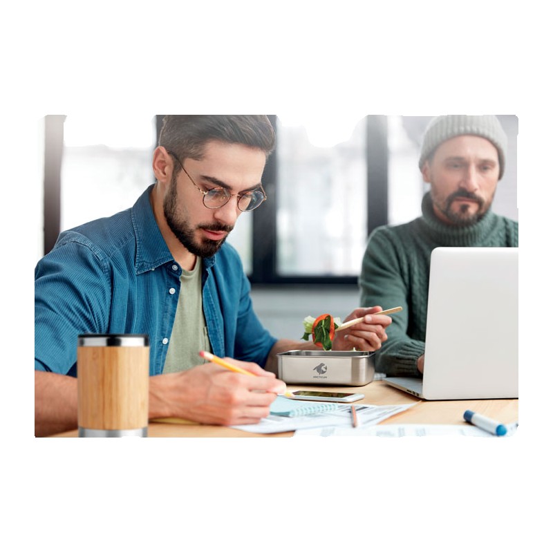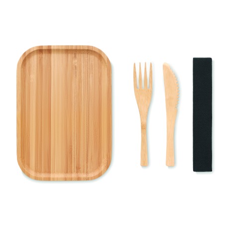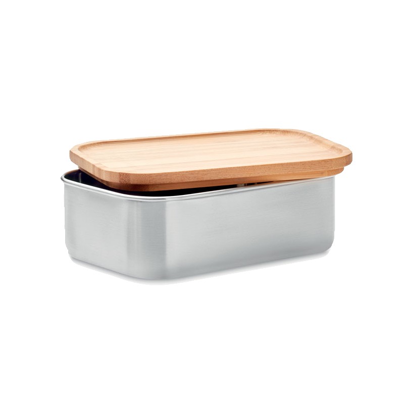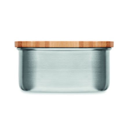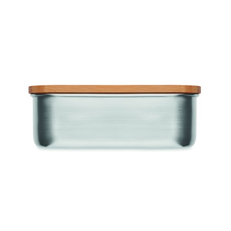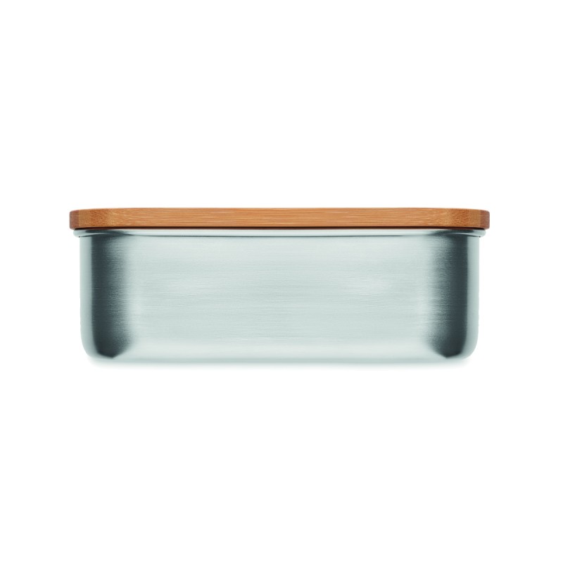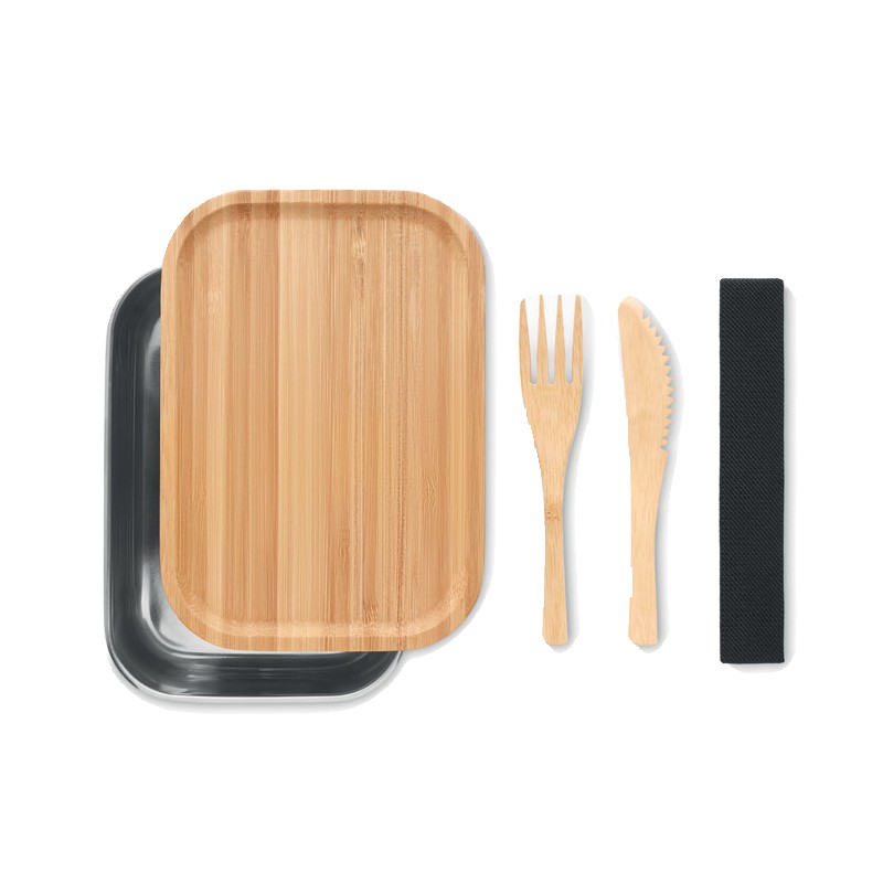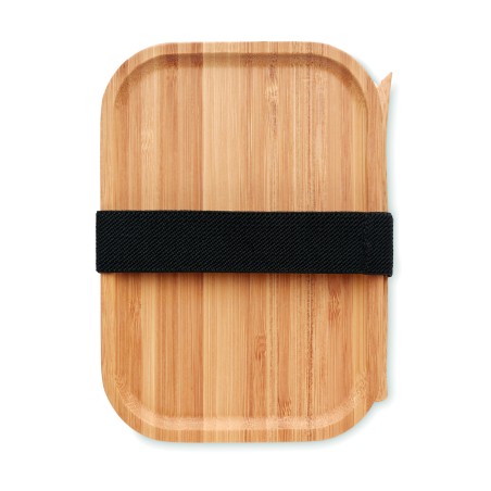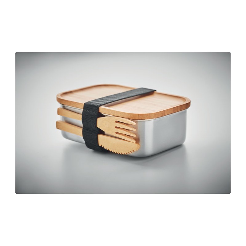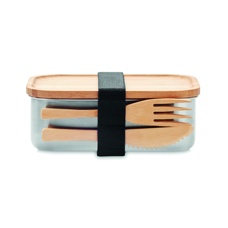 Lunchbox en acier inoxydable avec couvercle en bambou et 2 couverts. Bande élastique en polyester. Contenance 600 ml. Le bambou est un produit naturel, il peut y avoir des variations de couleur et de taille par article.