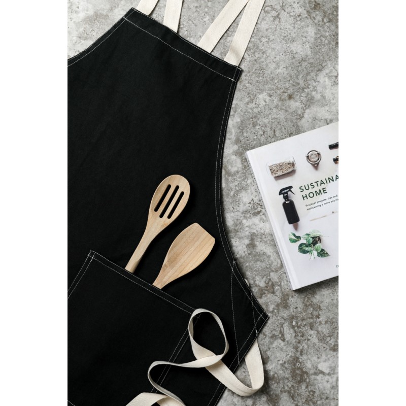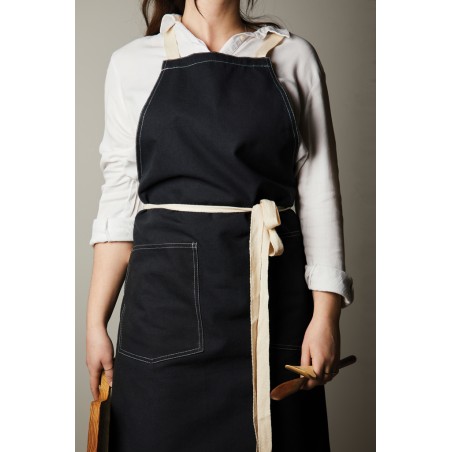 Tablier fabriqué à partir de 70% de coton recyclé certifié provenant des déchets de coton des fournisseurs. Des fibres habituellement considérées comme inutilisables ont, grâce à un processus de fabrication approprié, atteint les propriétés souhaitées. Ce tablier est extra large pour offrir une protection maximale. Deux grandes poches frontales et une boucle pour suspendre des ustensiles ou un torchon.