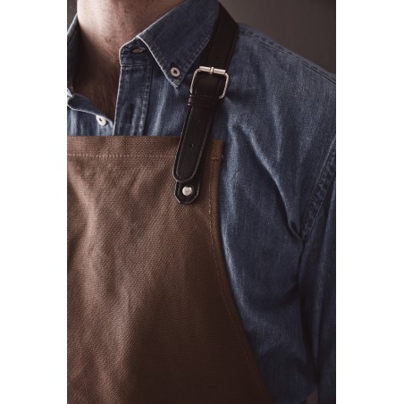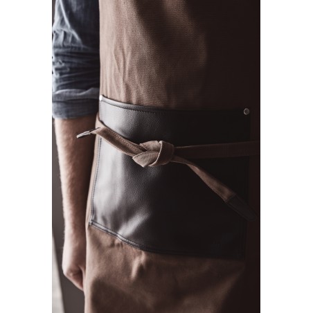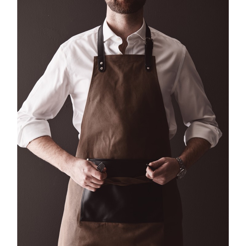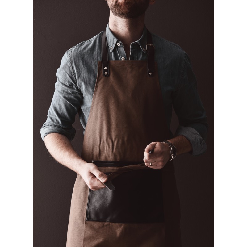 Tablier élégant et classique en toile de coton épaisse avec des détails discrets en PU. Fermeture à boucle réglable en haut et grande poche à l'avant. Un tablier à la longue durée de vie qui ne fait que s'embellir avec le temps.