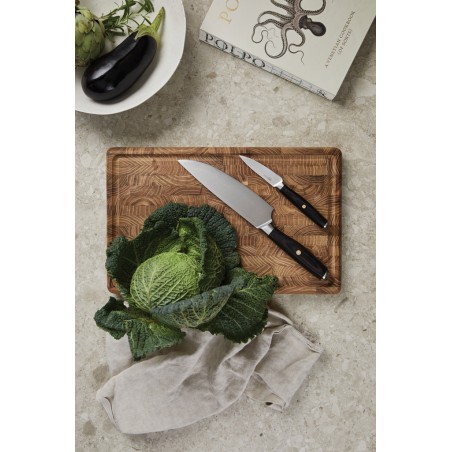 Le set du chef Tara fabriqué en acier inoxydable 5Cr15Mov, offre à la fois style et polyvalence. Le couteau du chef est doté d'une lame de 21 cm, efficace pour de nombreuses tâches en cuisine. Le couteau d'office, avec sa lame courte, est idéal pour les tâches qui exigent précision et finesse. Le magnifique manche en bois de pakka offre une prise en main confortable et sûre, tandis que le superbe équilibre de la lame garantit une grande facilité d'utilisation. Taille du couteau du chef : 33 cm (lame 21 cm). Taille du couteau d'office : 19,5 cm (lame 8,5 cm). Laver à la main uniquement pour garantir une longue durée de vie.