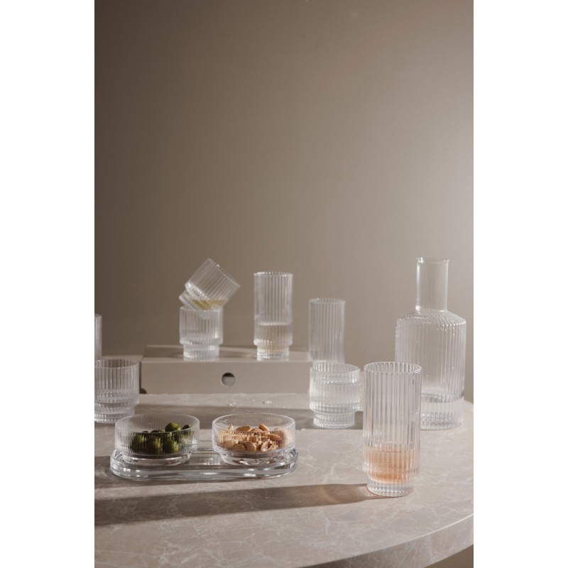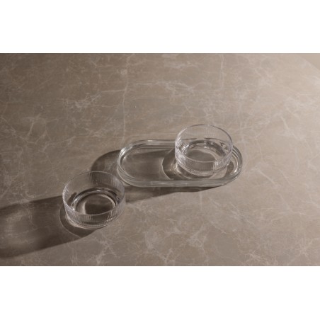 Un ensemble à tapas au design intemporel et aux lignes classiques et épurées. Idéal pour toutes les occasions où vous souhaitez servir de petits plats, des amuse-bouches ou d'autres accompagnements avec style et élégance. L'ensemble comprend deux bols et un plateau, qui peuvent être utilisés ensemble ou séparément. Fabriqué en verre sodocalcique. Les bols ont une contenance de 250 ml. Lavable au lave-vaisselle.