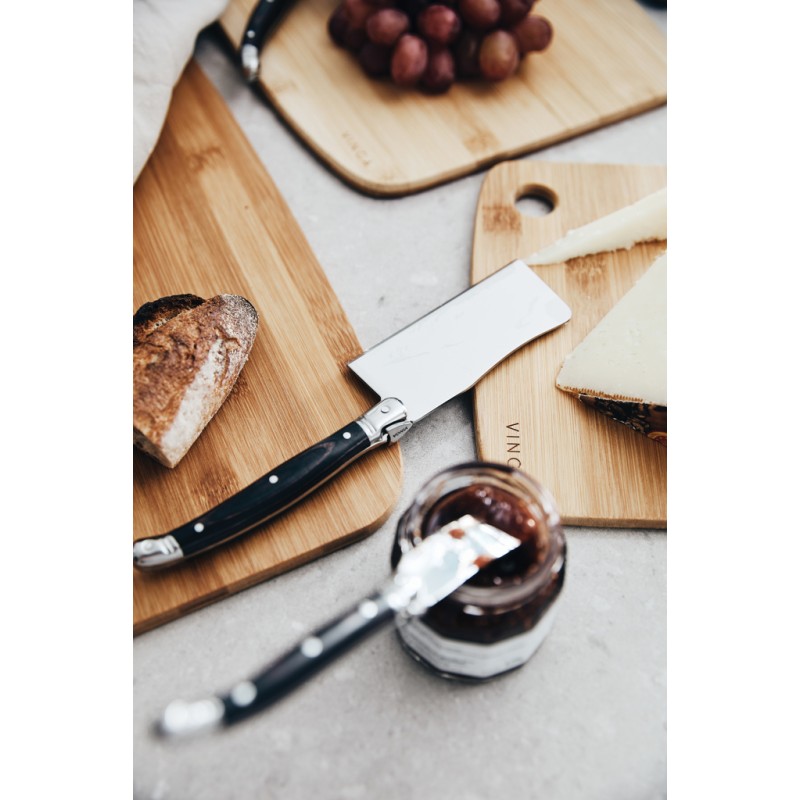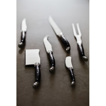 Ensemble exclusif de couteaux à fromage en acier inoxydable, composé de deux couteaux à fromage et d'un couteau à beurre avec un manche en pakkawood noir. Emballé dans une boîte cadeau exclusive.
