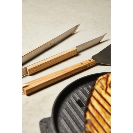 Une spatule solide en acier inoxydable résistant, parfaite pour cuire un morceau de poisson ou de pizza à la poêle. Manche en frêne.