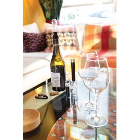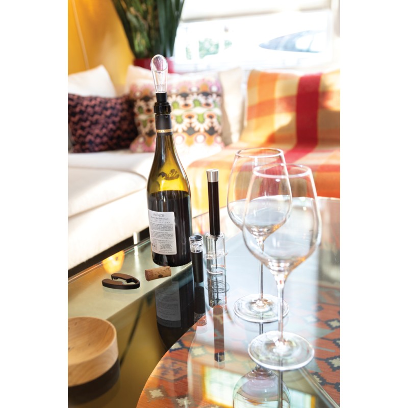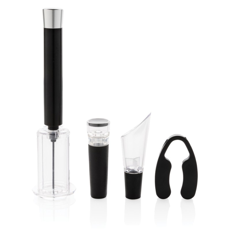 Set 4pcs se compose d'un tire-bouchon pneumatique, d'un coupe capsule, d'un bouchon avec pompe à vide d´air et d'un bec verseur avec aérateur. Emballé dans un luxueux tube cadeau.