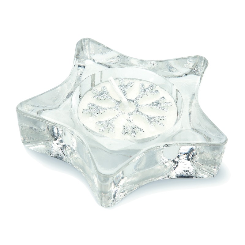 Bougeoir en verre en forme d'étoile dans une boîte en argent avec couvercle transparent et ruban décoratif. Bougie chauffe-plat incluse.
