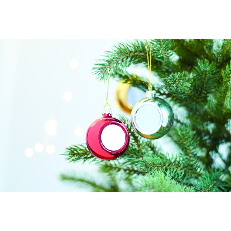 Boule de Noël en PP brillant, comprenant plaque pour impression par sublimation. Diamètre 6 cm.
