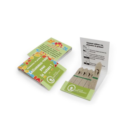 Pochette (40x50mm fermée) contient 5 bâtonnets en carton avec des graines micro-encollées. Simple à utiliser, il suffit de planter les bâtonnets et de les arroser régulièrement pour voir pousser un mélange de fleurs ou d’aromatiques.