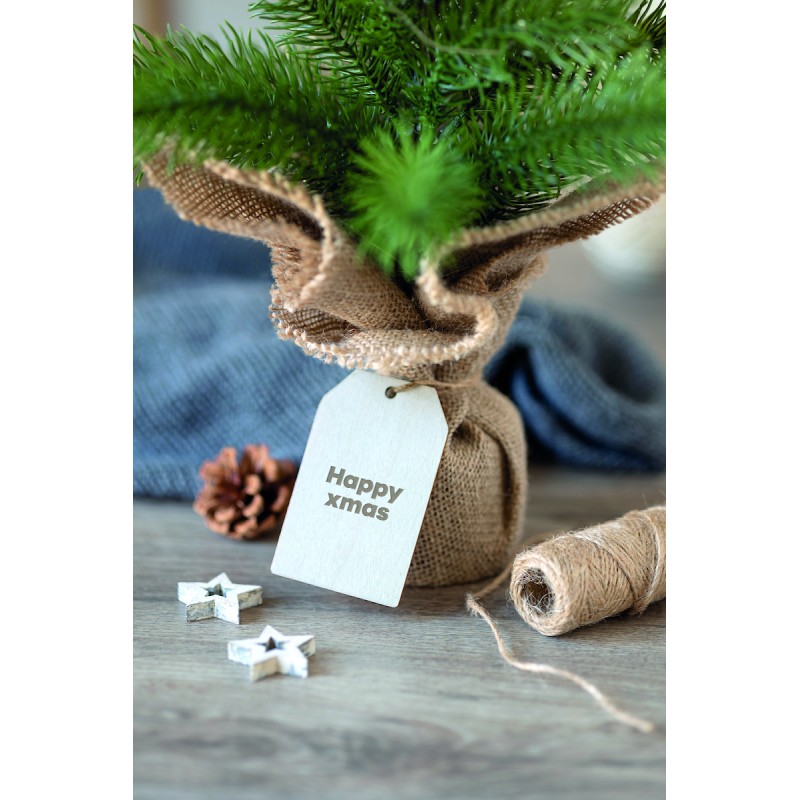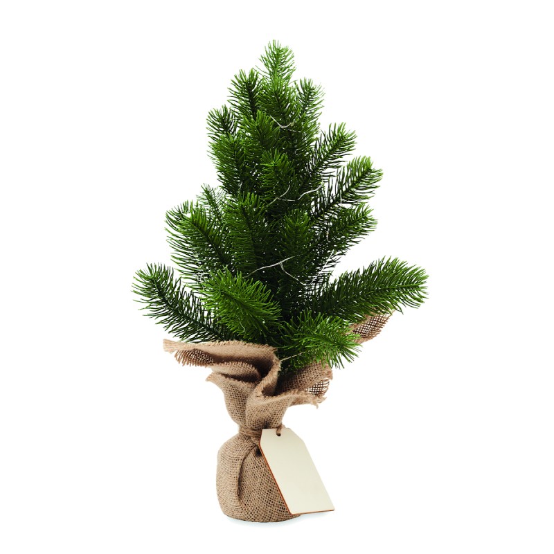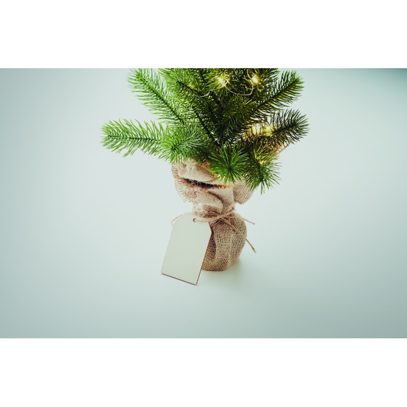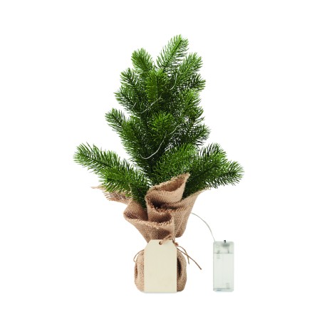 Mini sapin de Noël artificiel (PE) avec guirlande lumineuse jaune chaud de 20 LED sur une base en jute. Livré avec une étiquette cadeau en bois. 2 piles AA non incluses.