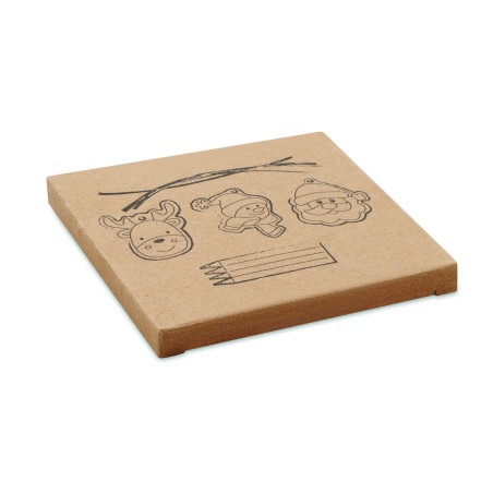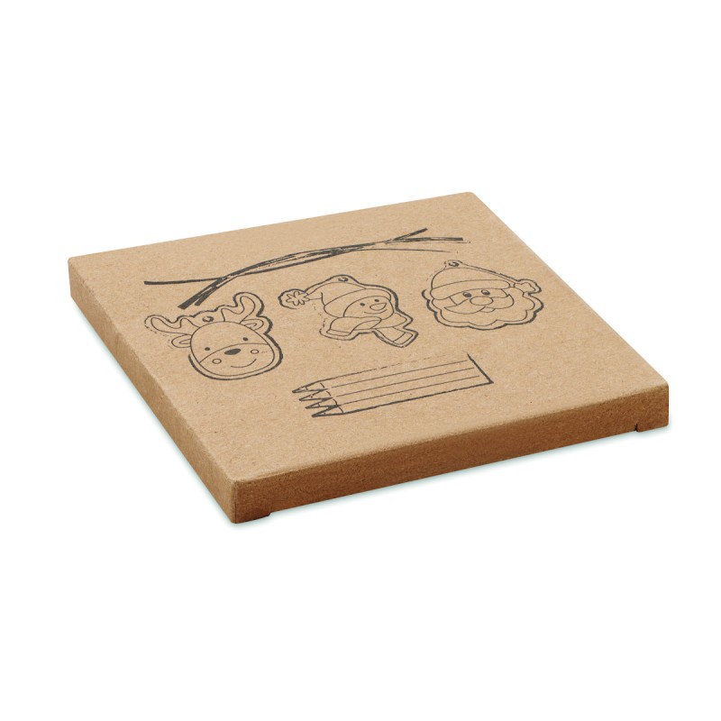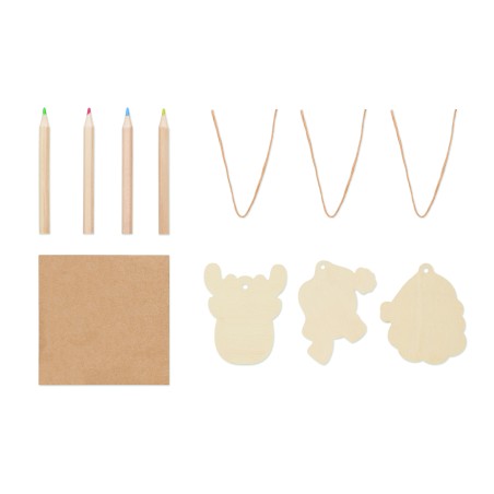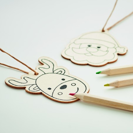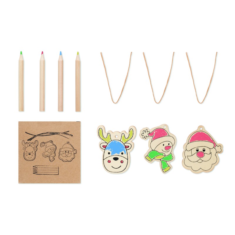 Lot de 3 décorations de Noël en bois à colorier avec 4 crayons de couleur. Présenté dans une boîte kraft. Le bois est un produit naturel, et présente de légères variations de couleur, de décoration et de tailles.