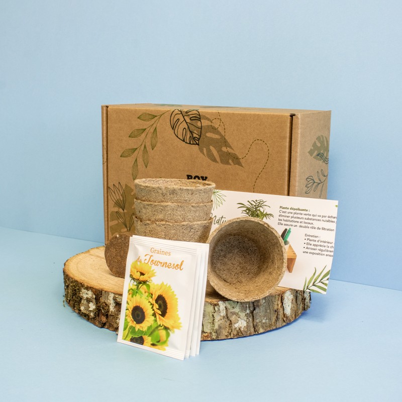 Box carton 200x140x80mm contenant une carte, 4 pots en fibre de bois ø60mm, 4 sachets de graines standards thermosoudés 60x80mm ou bulbes de trèfles et 4 plaquettes de tourbe ø38mm.