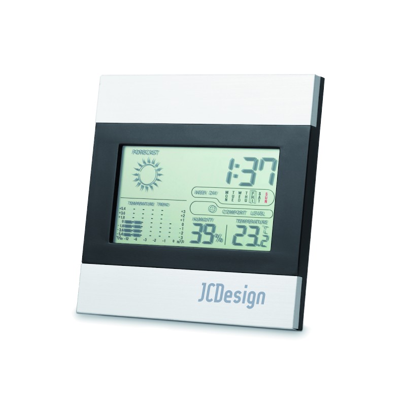 Cette station météo tendance noire et argent inclut une horloge, un affichage de la température et du taux d'humidité et un calendrier. 2 piles AAA non incluses.