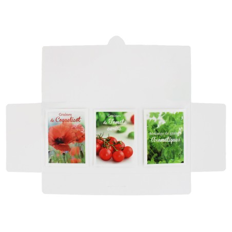 Carte pochette dépliant papier 350g/m² format fini : 210x100mm, ouvert: 310x222mm renfermant 3 sachets de graines standard thermosoudés (Papier PE) 60x80 mm. Graines garanties de germination, validité 2 ans. Variétés au choix parmi nos standards : aromates, fleurs en mélange, basilic, capucine, ciboulette, cosmos, cresson, épicéa, fraise des bois, gazon d'intérieur, mimosa pudica, menthe, tournesol, radis, tomate cerise, coquelicot, persil, bleuet, piment, mimosa.