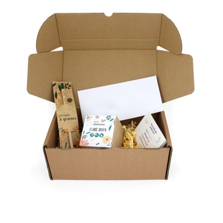Box carton 250x150x100mm contenant une carte, un bloc-note à graines, un crayon à graines avec étui standard (graines garanties de germination et issues de nouvelles récoltes variétés de graines au choix : mélange de fleurs, mélange aromatique, basilic, sauge, tournesol, tomate cerise, myosotis, thym, marguerite, épicéa, fraise, concombre, melon, aubergine) et un kit de plantation cube bois avec fourreau standard (Variétés au choix parmi nos standards : aromates, fleurs en mélange, basilic, capucine, ciboulette, cosmos, cresson, épicéa, fraise des bois, gazon d'intérieur, mimosa pudica, menthe, tournesol, radis, tomate cerise, coquelicot, persil, bleuet, piment, mimosa).