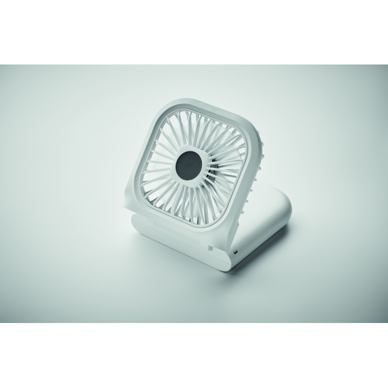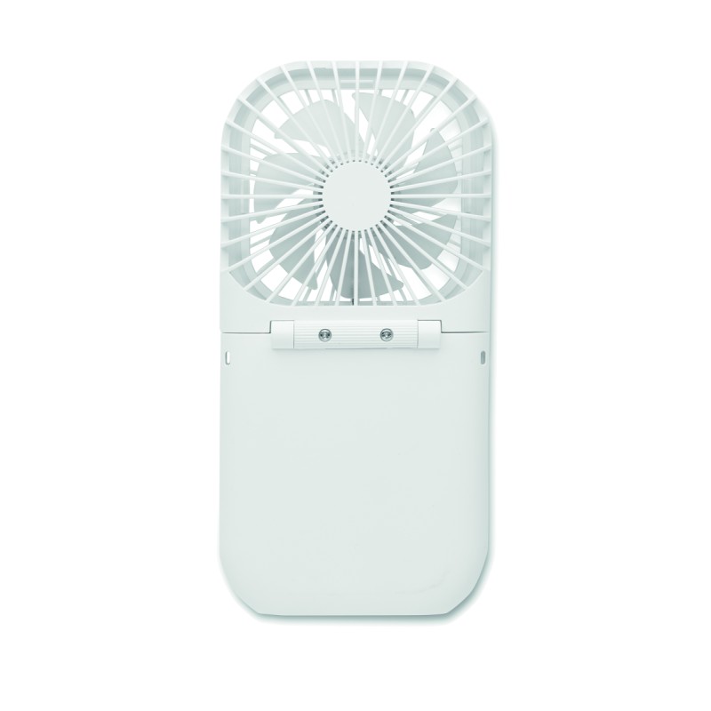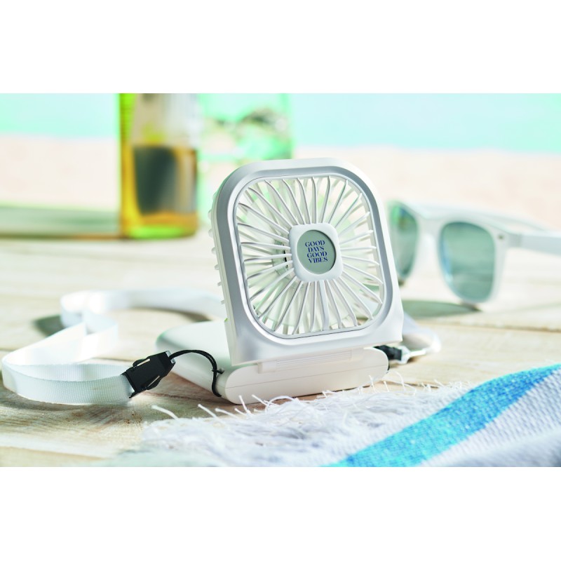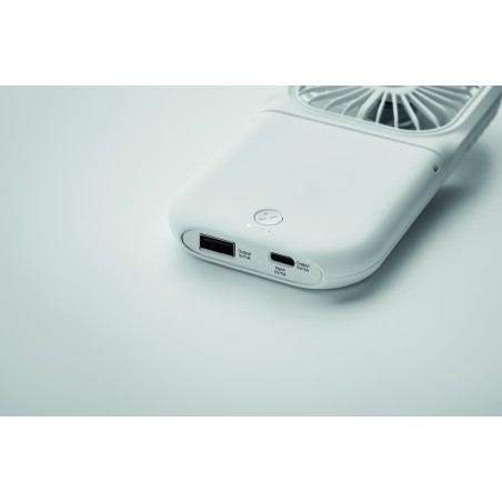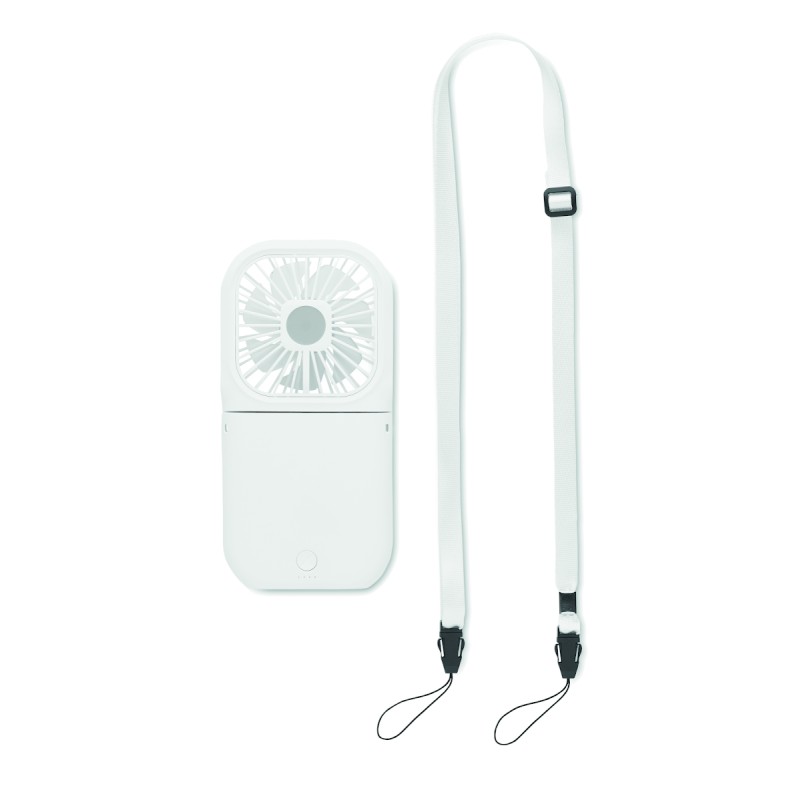 Ventilateur portable pliable avec lanyard réglable. 3 vitesses. Peut également être utilisé comme ventilateur de bureau lorsqu'il est plié. Powerbank rechargeable 3000 mAh. Entrée type C. Sortie type A et C.