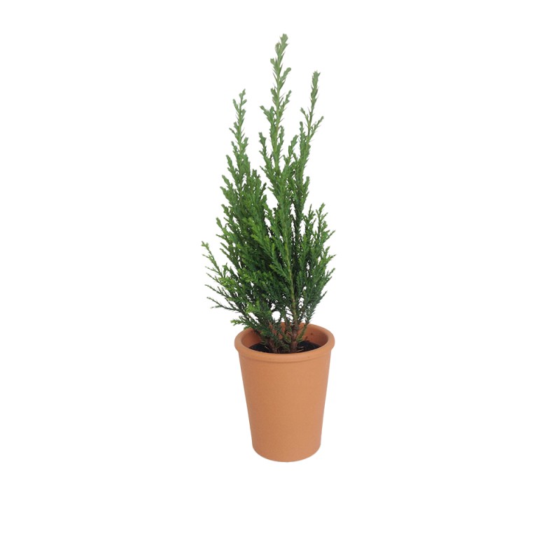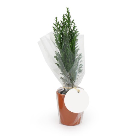 Mini sapin dans un pot en terre cuite (Ø70mm x H75 mm) emballé dans un papier fleuriste ou un papier kraft afin de conserver l'humidité dans le pot avec une étiquette liée avec un brin de raphia.